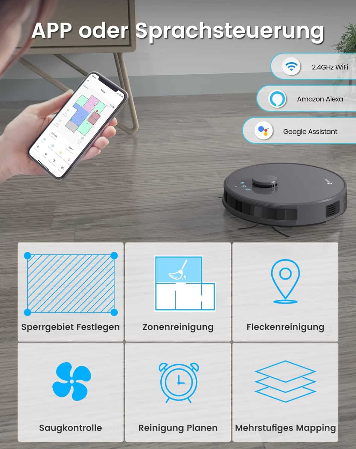 The Lefant M1 can be easily controlled via the Lefant app. This allows users to plan cleaning areas, define no-go zones and track the cleaning process. Convenient voice control is also possible. After all, the robot is compatible with Alexa and Google Assistant. This allows you to start or stop the cleaning process effortlessly – even from a distance.