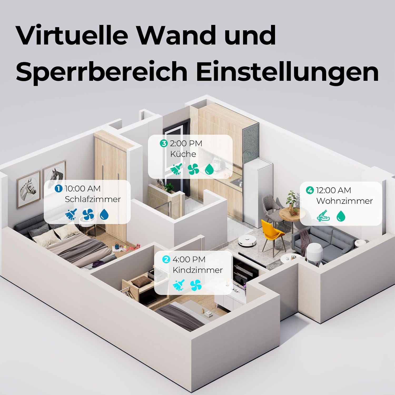 The robot hoover is also equipped with voice control (supported by Alexa and Google Assistant). The associated app can be used to create cleaning schedules or define no-go zones in order to tailor cleaning precisely to your own needs.