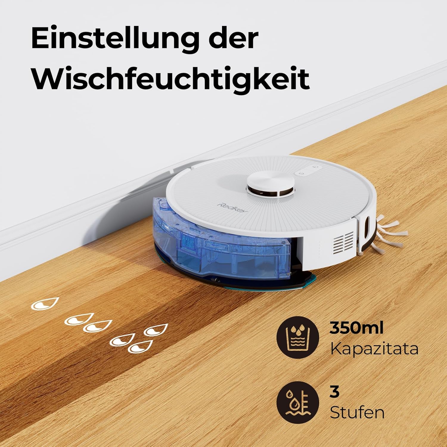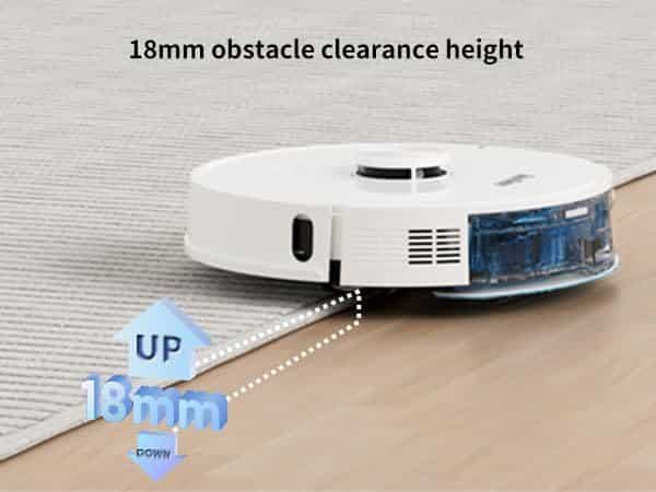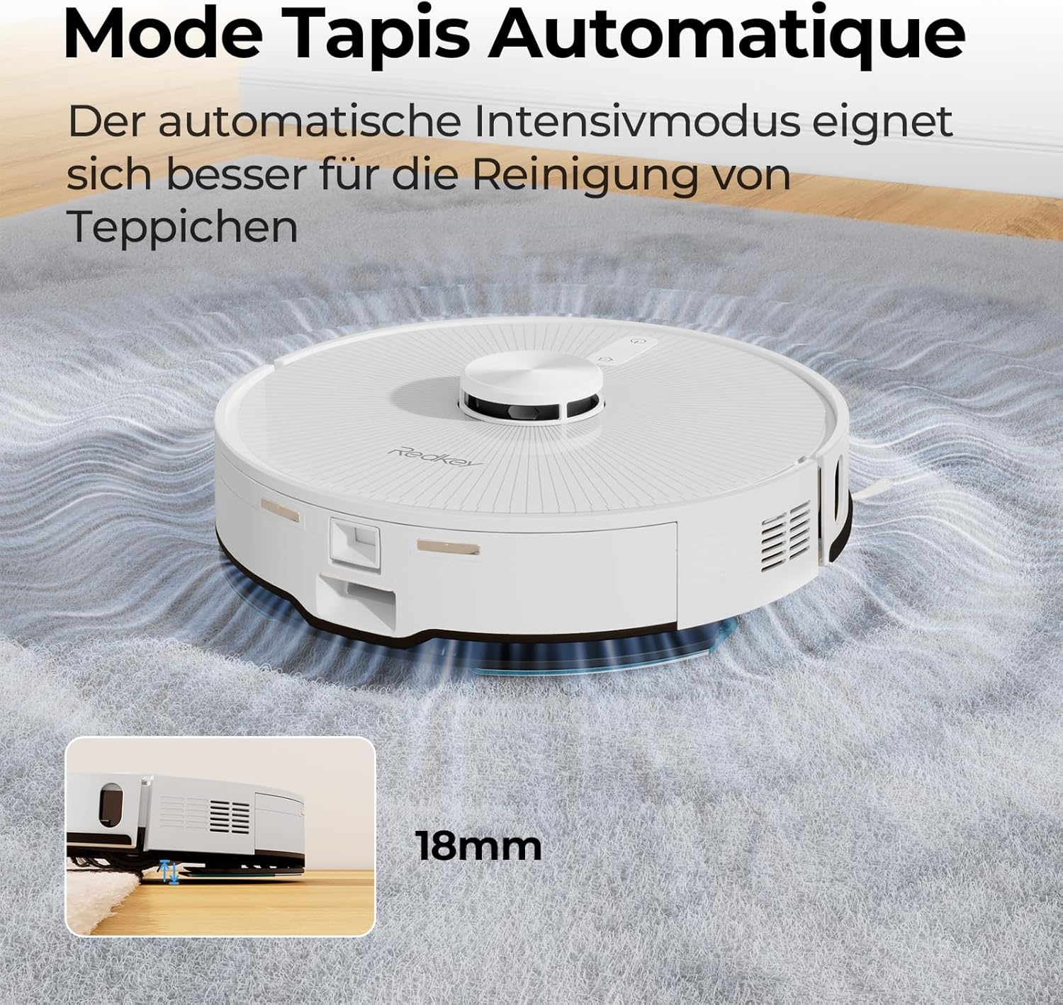 The Redkey R10 impresses with a powerful suction power of 4000 Pa, which easily removes even the finest dust, pet hair and dirt. Thanks to its ultrasonic sensors, it automatically detects carpets and adjusts the suction power to thoroughly remove even deep-seated dirt.