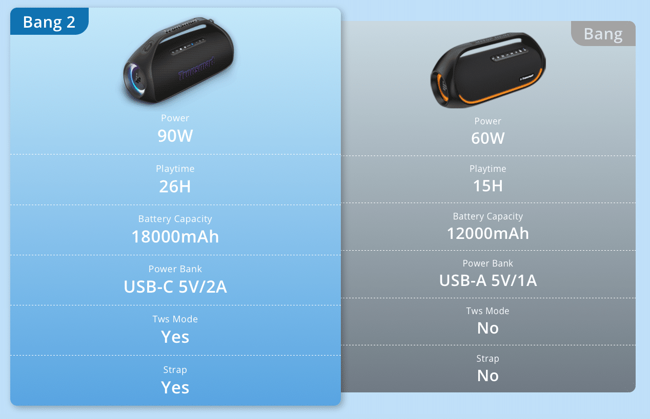 - Bang 2 delivers 90W of power with intense bass for outdoor parties