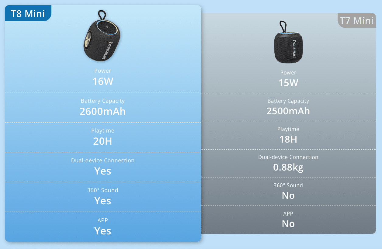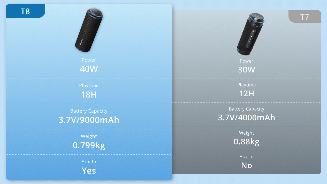 - T8 offers 40W omnidirectional sound with long-lasting battery for on the go