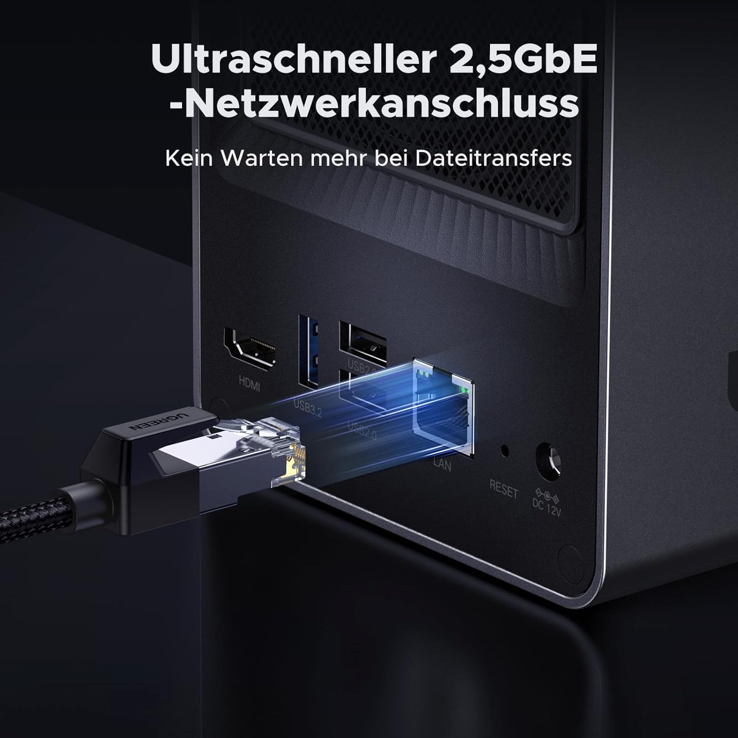 The UGREEN NASync DXP2800 is the manufacturer’s most compact solution and comes with 32 gigabytes of eMMC memory, which can be expanded to up to 64 terabytes of storage space via 2 SATA bridges. There are also two M.2 slots for the addition of up to 8 TB SSDs.