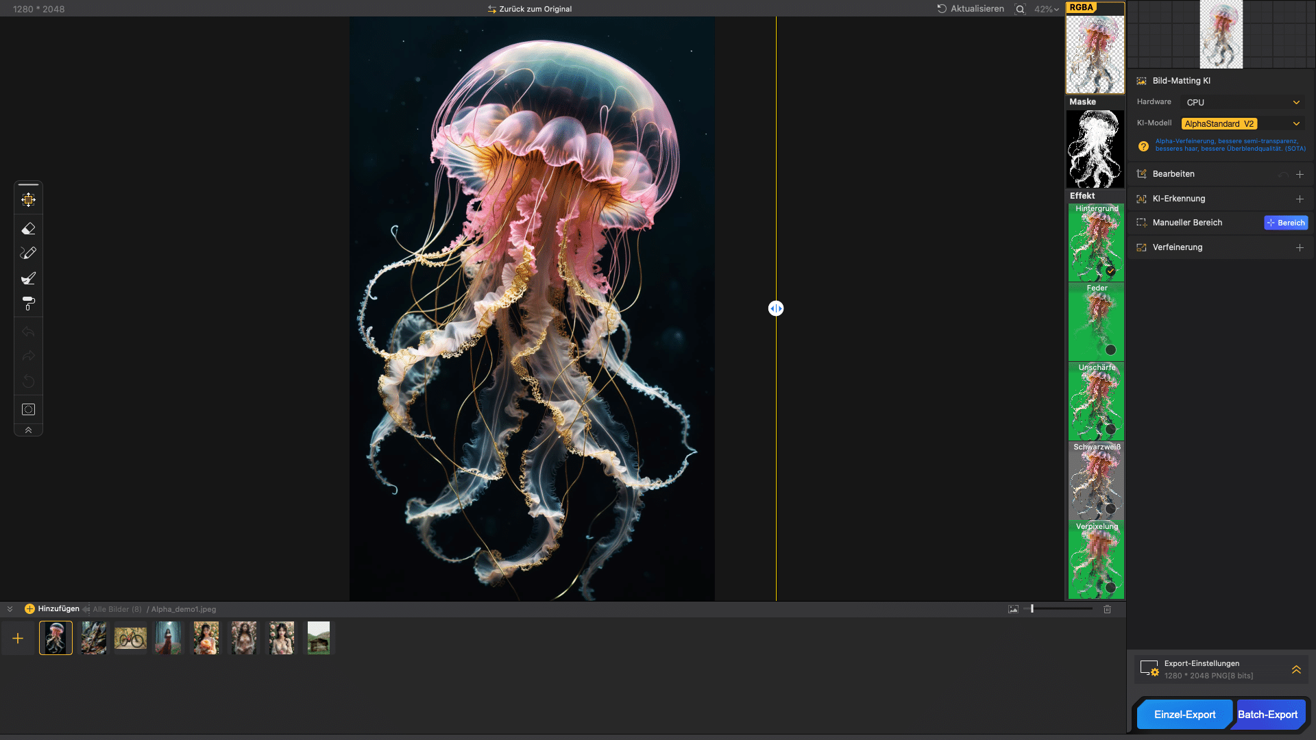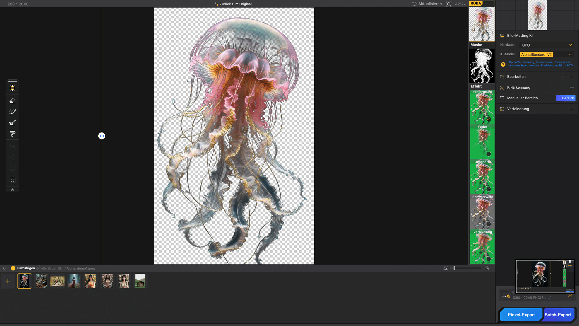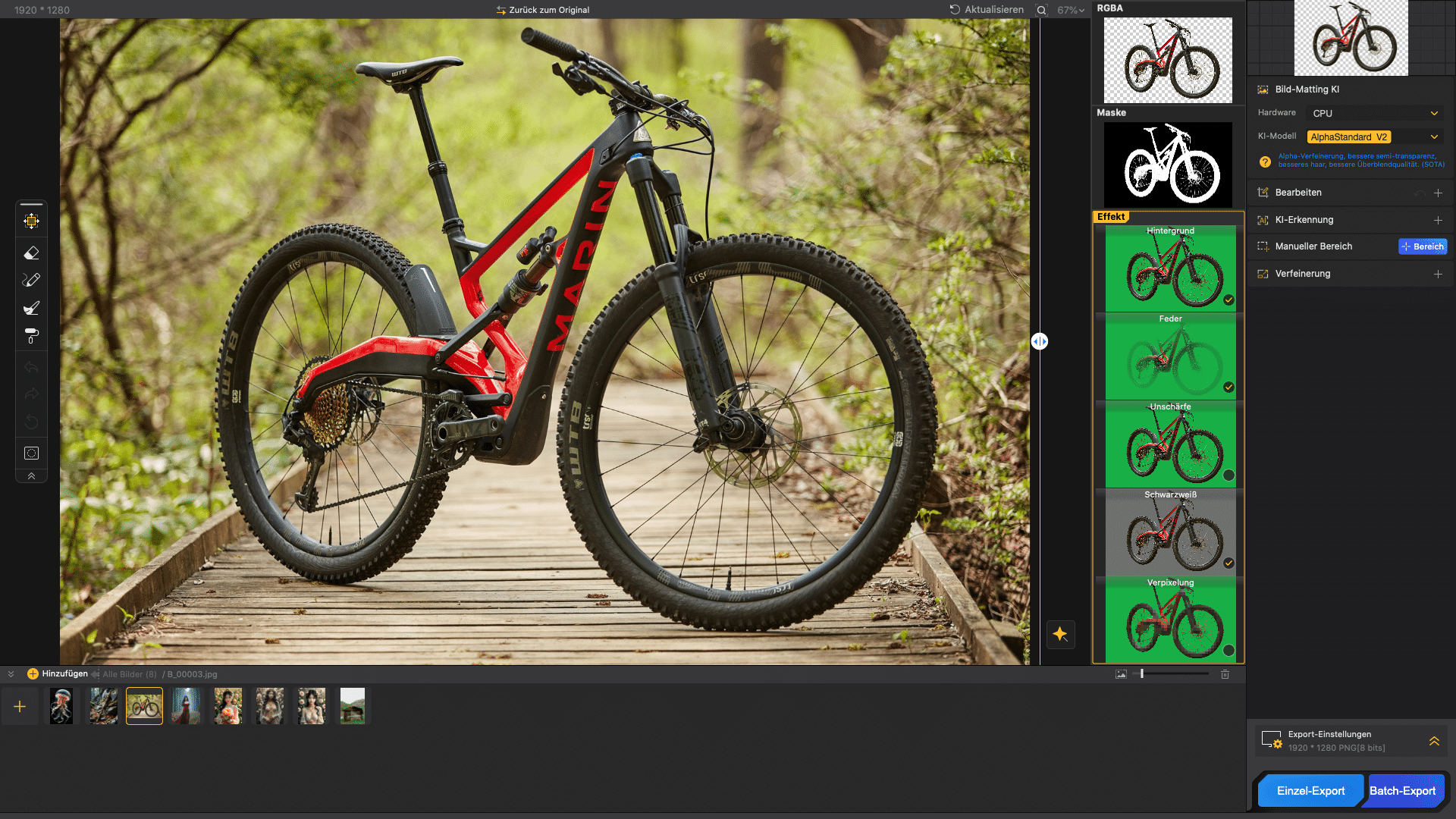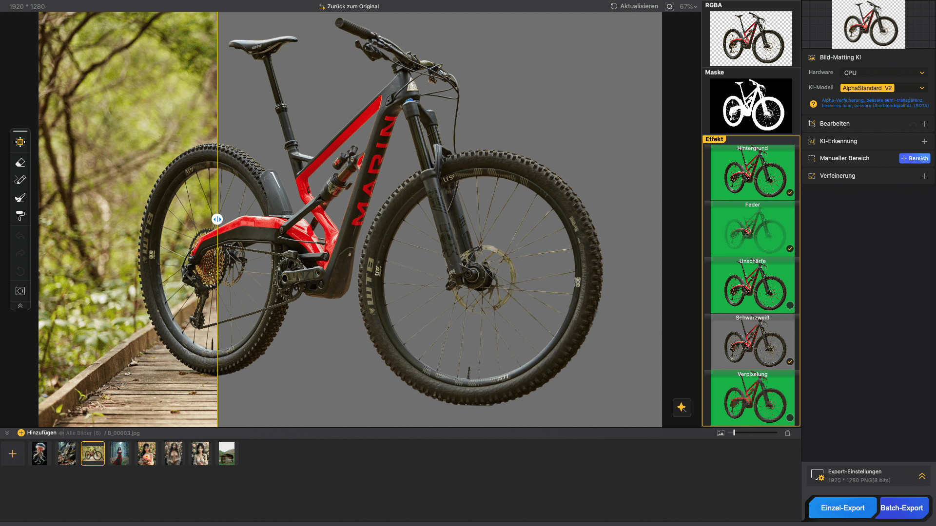 - High-precision background removal: The software uses four different AI models to recognize and preciselyremove objects with challenging backgrounds.