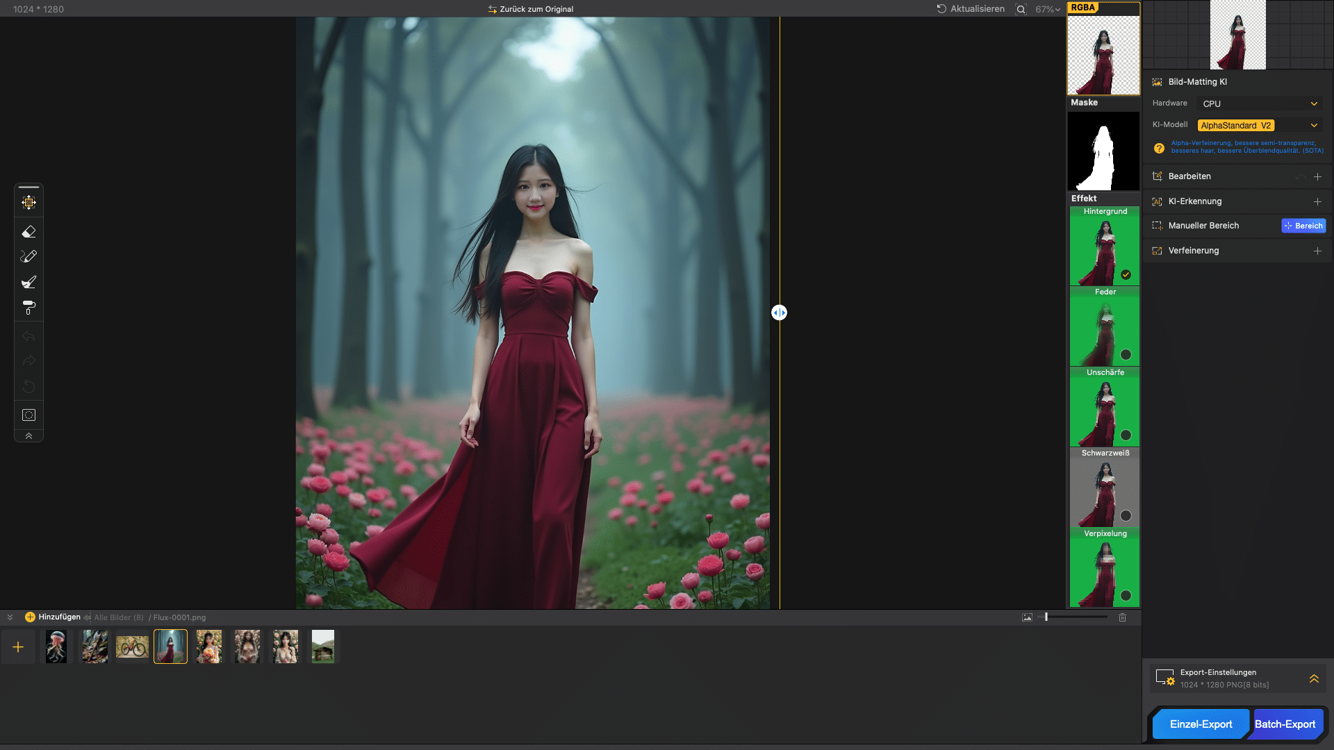 - 4K image quality and upscaling: Images can be enhanced to 4K quality and upscaled by double before or during the matting process.