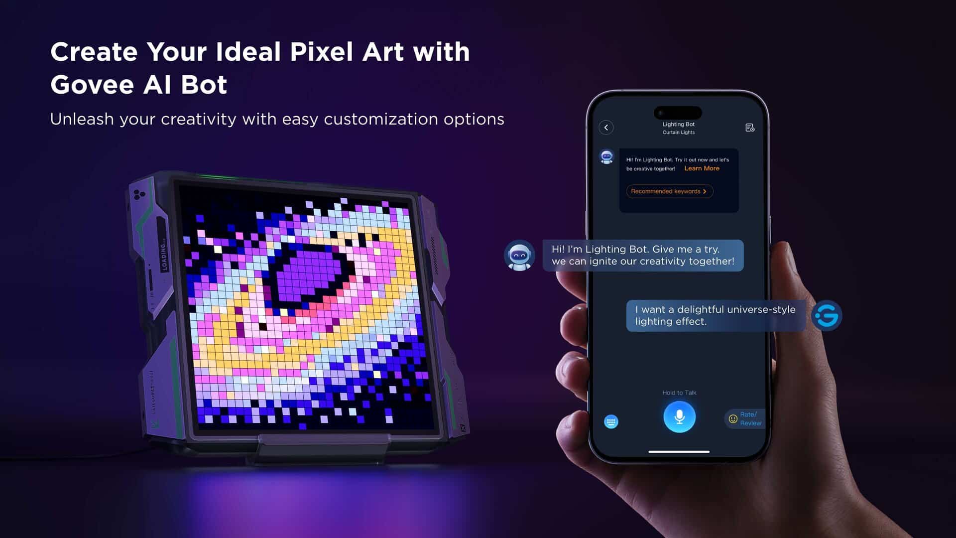 Users can convert text commands into lighting effects using the “Lighting Bot” in the Govee app. For example, the command “I want a universe-style lighting effect” creates a pixel-style galaxy on the display.