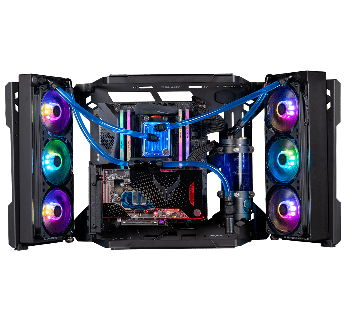 The alternative to the open-air PC is the testbench mode. A conversion should not be a problem here. For this, the side wings can be folded down quickly and easily. Now even powerful components get enough air to avoid overheating. Especially friends of overclocked graphics cards will be happy about this. The wings serve another purpose apart from the “conversion”. Components can also be installed here. The installation of a triple fan radiator is possible per wing. Apart from cooling, they are also suitable for installing other accessories.