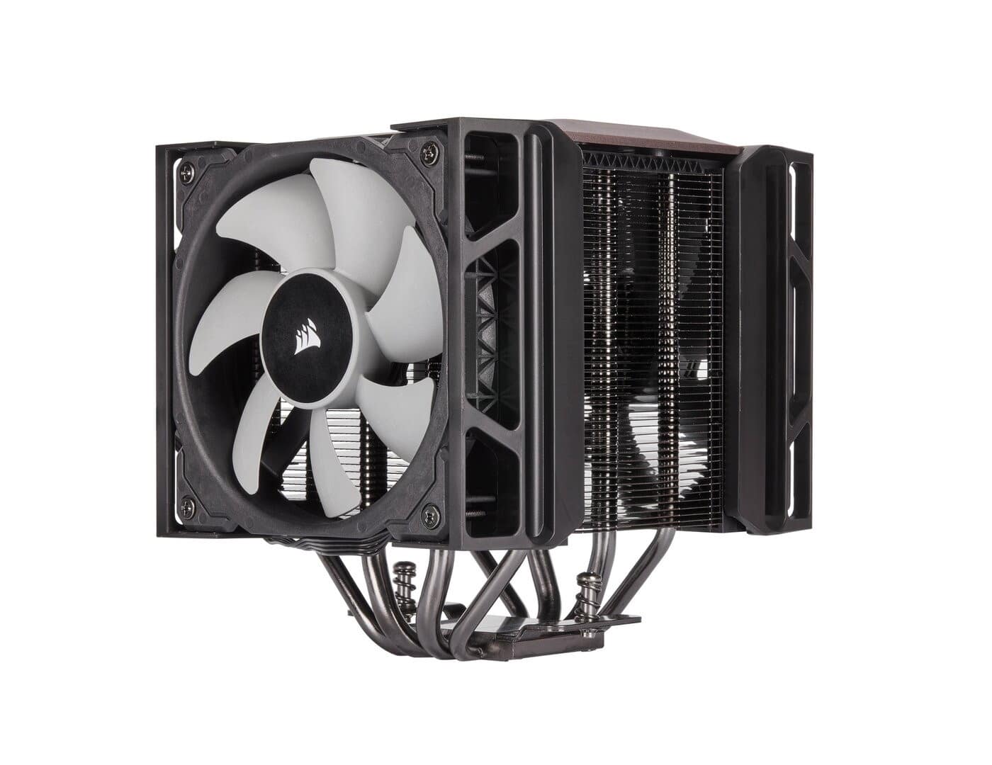 The performance data of the Corsair A500 give reason to hope for good air cooling: According to the manufacturer’s specifications, processors with a TDP of up to 250 watts should be cooled with it. Four nickel-plated copper heatpipes contribute to this – diameter of the outer heatpipes is 6 mm, the inner ones 8 mm – which have direct contact with the processor via the base plate. The fins are made of nickel-plated aluminium. The cooling capacity is thus sufficient for CPUs with Intel sockets LGA 115x, 2011(-3) as well as AMD FM1, FM2, AM3 and AM4. For AMD Threadripper on socket TR4 or TRX4, Corsair recommends a more powerful AiO water cooling.