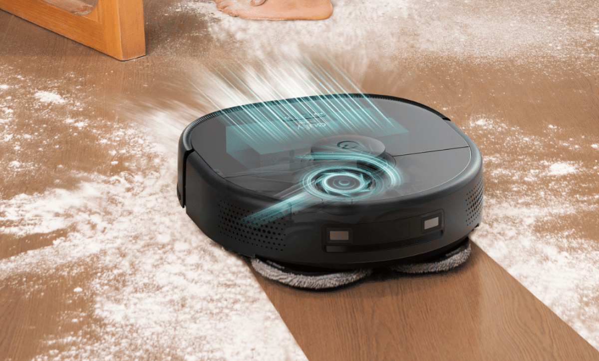 The robot vacuum has a suction power of 5,500 pascals and is equipped with MopMaster technology, which allows it to both vacuum and mop. It is also equipped with rotating mops that can spin 180 times per minute and generate up to one kilogram of contact pressure. When the robot encounters a carpet, it can automatically raise the mops up to 1.2 centimeters to avoid getting the carpet wet.