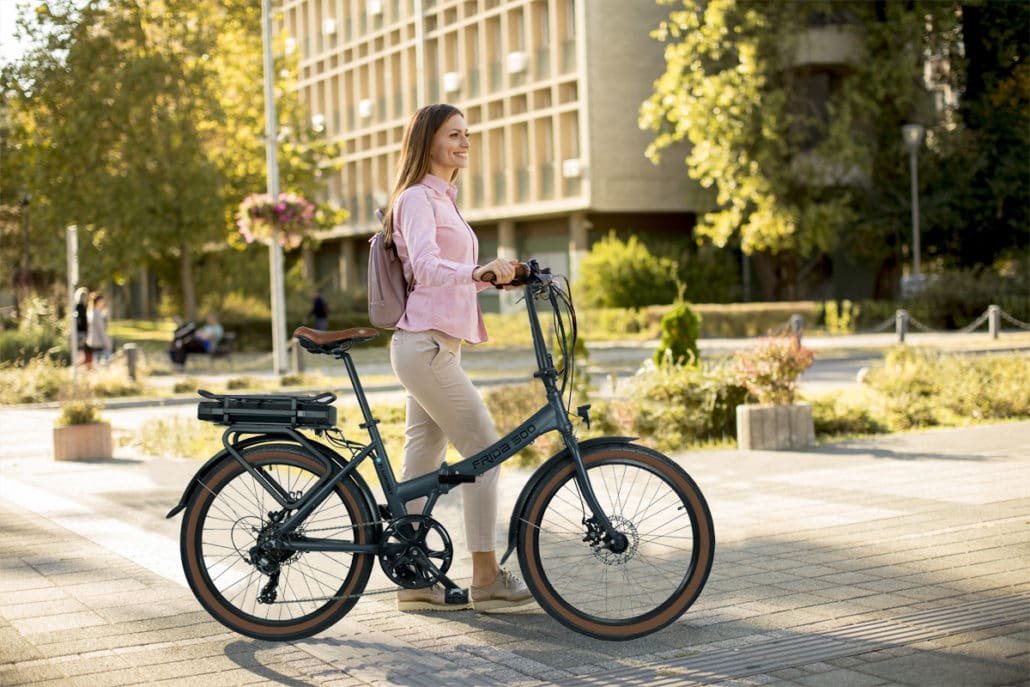 The Frida 500 can also shine visually. The manufacturer uses aluminum for the frame. The design is rather classically elegant. Especially the color with the name “lava gray” white to please. The contrast to the light brown accents completes the design of the folding e-bike.