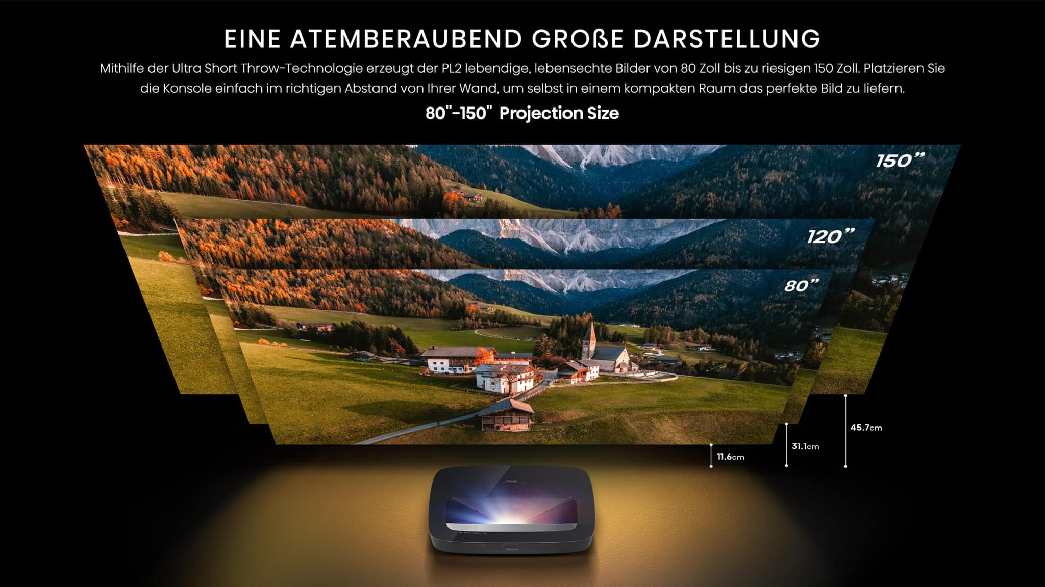 Size alone is not the only impressive feature of the new Hisense laser TV. Thanks to laser technology, impressively high-contrast and true-color images can also be displayed in brighter environments. The projection takes place over an ultra-short distance, which means that the TV can be placed just a few centimeters away from the wall. This saves space and ensures an elegant, minimalist design.