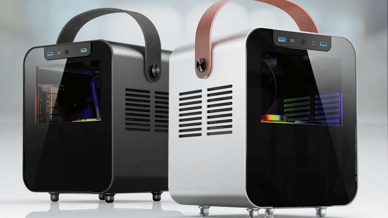 The Mini-ITX from Jonsplus is visually an absolute eye-catcher, so it has a tinted glass panel on the front, which is partially covered with an opaque coating. Thus, the cables and also the power supply are not directly pushed into the field of vision, but are neatly hidden. A brown leatherette handle is found on the upper side. The case itself is made of aluminum and is silver. All in all, it thus leaves a very noble and also distinctive impression.
