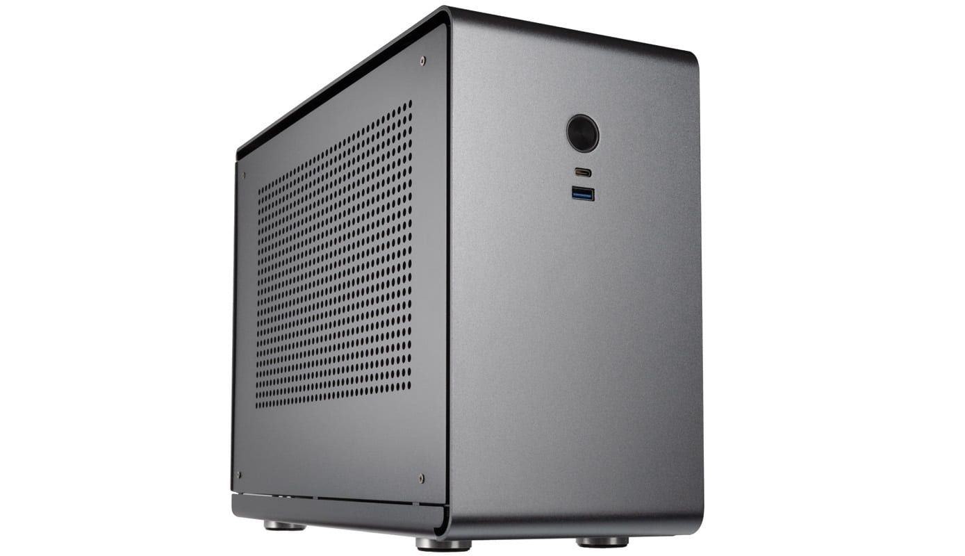 The Rocket V2 cleverly hides the powerful hardware behind its noble appearance. The outer shell of the case is made of anodized aluminum in titanium grey with a thickness of 2.5 mm. The interior of the Mini-ITX case has been enlarged compared to its predecessor, so the hardware has more space. Due to an intelligent cooling concept, which has separate chambers for the graphics card and the processor, the temperatures inside are well under control. The GPU is installed in a separate chamber behind the mainboard in mini-ITX format using a PCIe-3.1×16 riser card. Behind it is a well thought-out concept to get a complete gaming PC, regardless of the size of the case. With dimensions of just 150 x 270 x 350 mm (W x H x D) and a volume of 13.8 liters, the case is just as large as a game console and therefore needs a good concept.