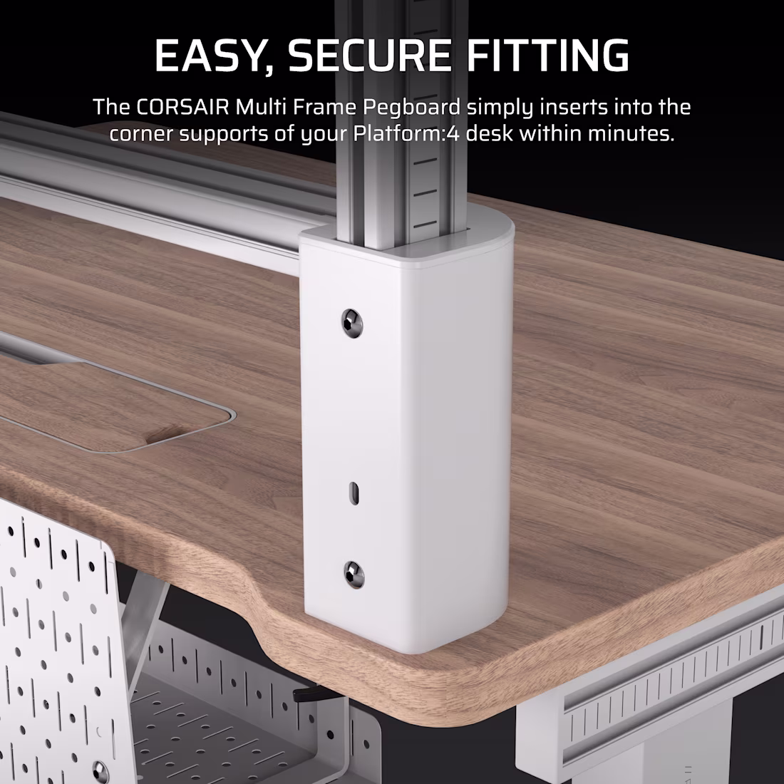 CORSAIR’s Multi Frame perforated panel was developed specifically for users who prioritize order and efficiency at their workstation or streaming rig. At its heart are two perforated metal panels that can be seamlessly mounted to existing Platform:4 desks. The entire system follows a well thought-out concept: the combination of vertical storage space and horizontal extension creates a clearly arranged, ready-to-hand storage area – ideal for tools, hardware or collector’s items.