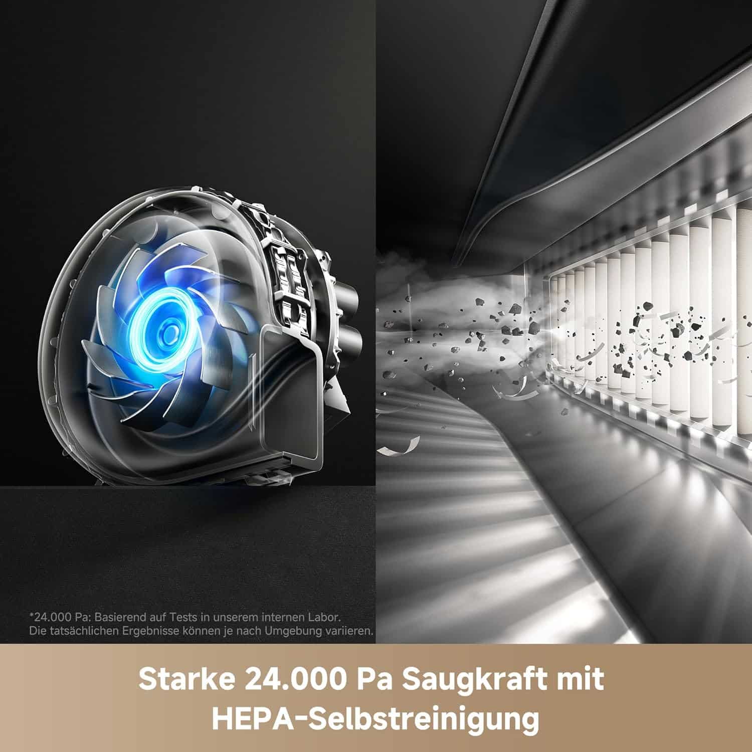 This promises comprehensive cleaning on a wide variety of floor coverings. The V50 is not just superficially thorough: an integrated HEPA filter system ensures clean air, while three anti-tangling mechanisms prevent hair from getting stuck inside. This makes it particularly interesting for households with pets.