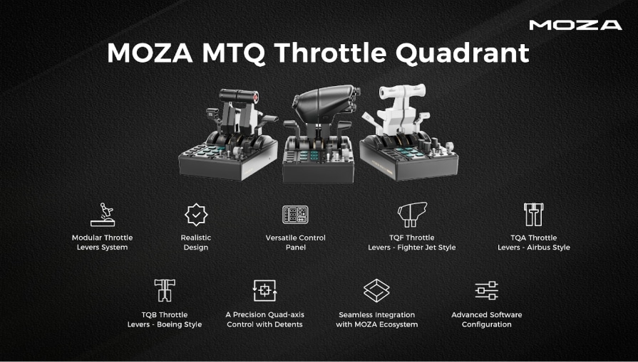 MOZA relies on a modular concept with the MTQ Throttle Quadrant. The throttle is designed for a wide variety of aircraft types – from single-engine aircraft to multi-engine airliners. Thanks to interchangeable handles, customizable movement axes and professional haptics, the MTQ is suitable for both civilian long-haul flights and military missions. The set-up remains simple: plug-and-play functionality ensures a quick start.