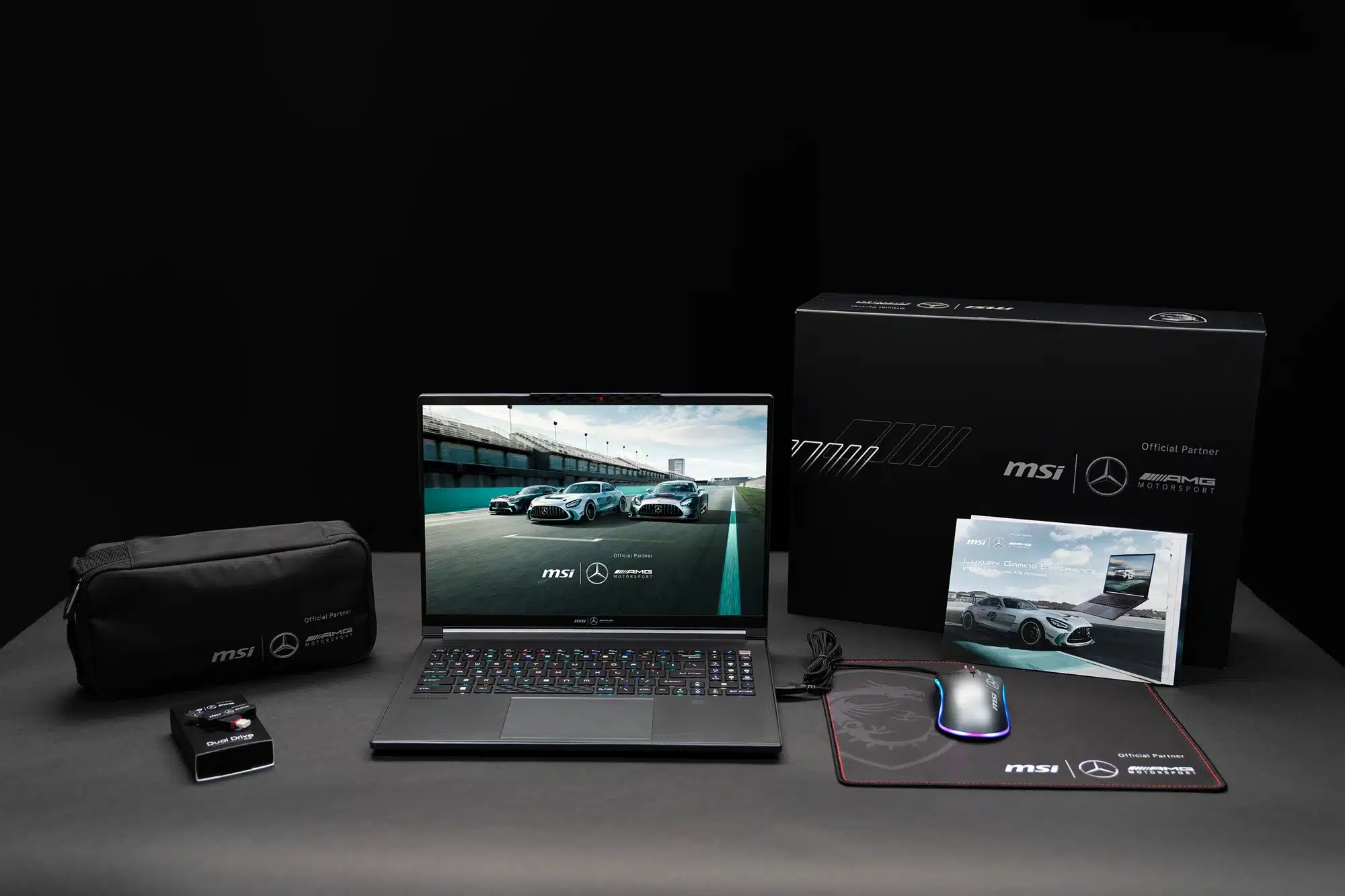 MSI has unveiled a limited edition of the Stealth 16, developed in collaboration with Mercedes-AMG. The design of the gaming notebook was inspired by racing cars and features a carbon pattern around the webcam, a magnesium case in Selenite Gray and an AMG diamond pattern. Furthermore, Mercedes AMG logos can be found on the display lid as well as on the bottom edge of the screen.