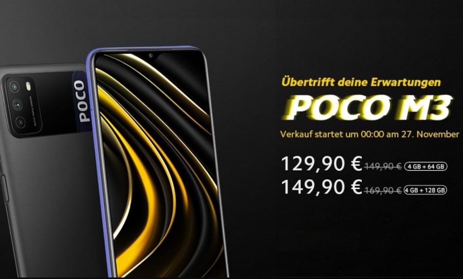 In Germany the M3 is offered in two versions. The basic version with 4 GByte RAM and 64 GByte memory costs 149 Euro. From November 27 to November 30, 2020, the smartphone is available for 129 Euro in the Poco Onlineshop. The model with 4 GByte RAM and 128 GByte memory costs 169 Euro as a regular model, during the flash sale it is available for 149 Euro. According to Poco, sales in Germany will officially start on December 2.