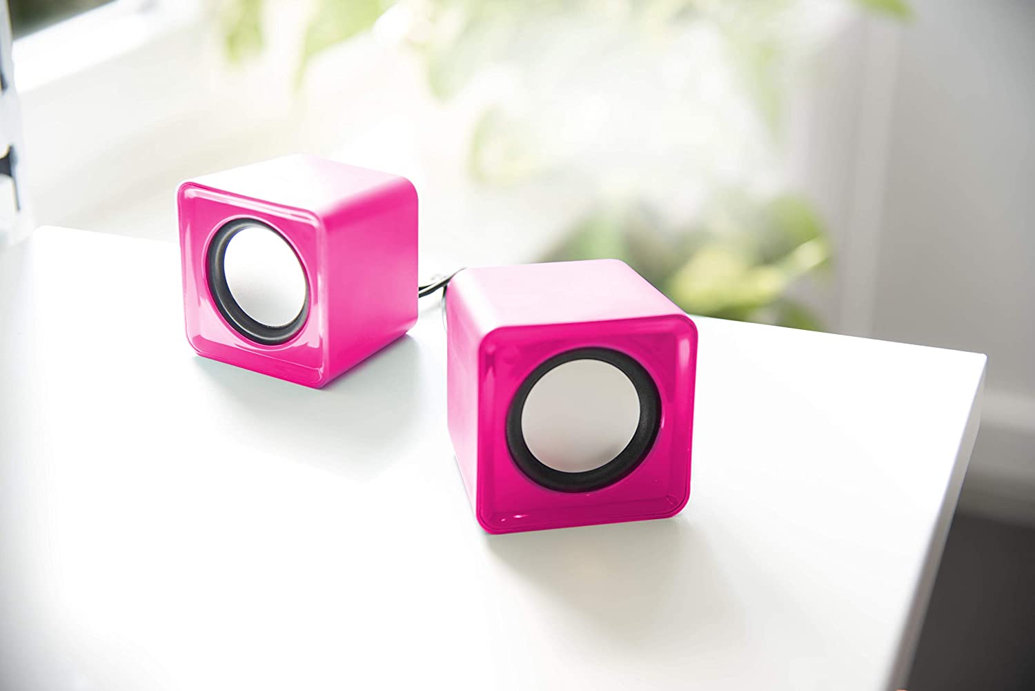 Speedlink describes its TWOXO Stereo Speakers as “space-saving magic cubes”. Considering their low weight of just 188 grams and an edge length of just six centimeters, they more than deserve this name. But it remains to be seen whether the two stereo loudspeakers can actually do magic. Speedlink promises in any case a powerful multimedia sound for all areas of application. One is however already certain at first sight. The TWOXO Stereo Speakers fit perfectly to the pink desk set.