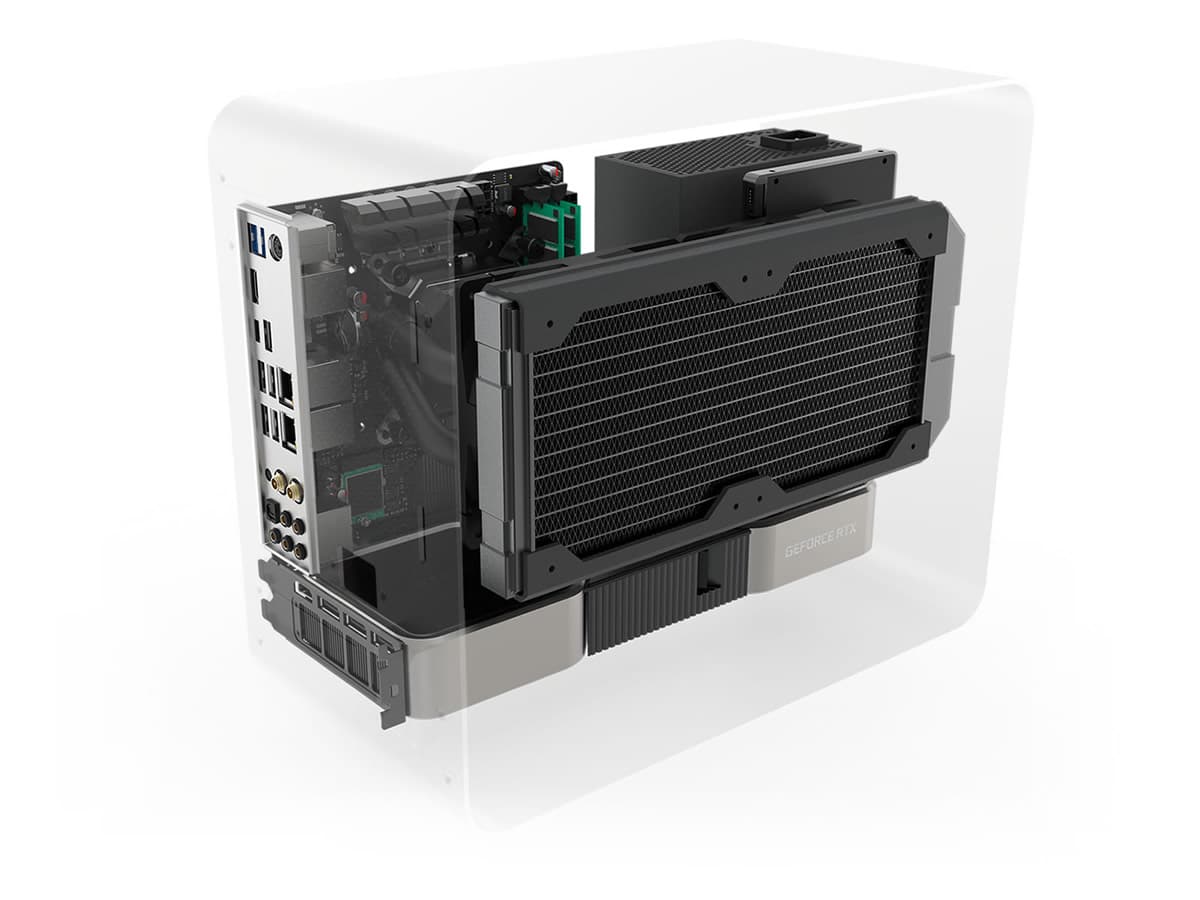 Coolers can be installed up to a height of 145 mm. For radiators the maximum possible size is 280 mm. Depending on the configuration, instead of an SFX power supply, a model in the ATX form factor can be selected up to a size of 225 mm. The quantity and also size of the fans depends on the placement of the rails and the selection of the other components.
