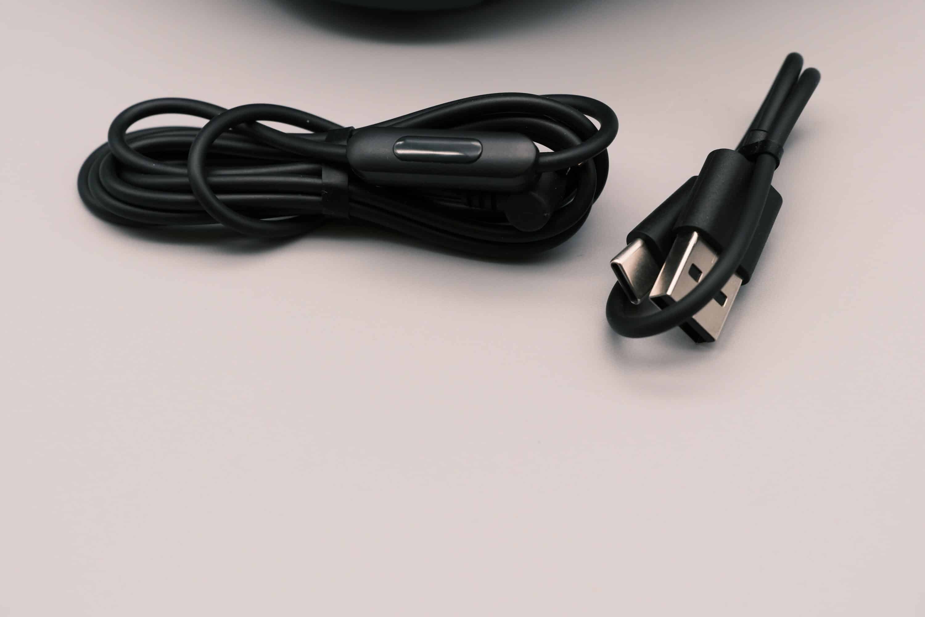 However, wired use is also possible. This is because there is a 2.5 mm jack connection on the underside, which can be used to easily connect to most audio sources using the included 2.5 mm to 3.5 mm cable. The cable also has an inline remote control. Very practical, even if I don’t understand why a 3.5 mm jack connection wasn’t installed straight away.