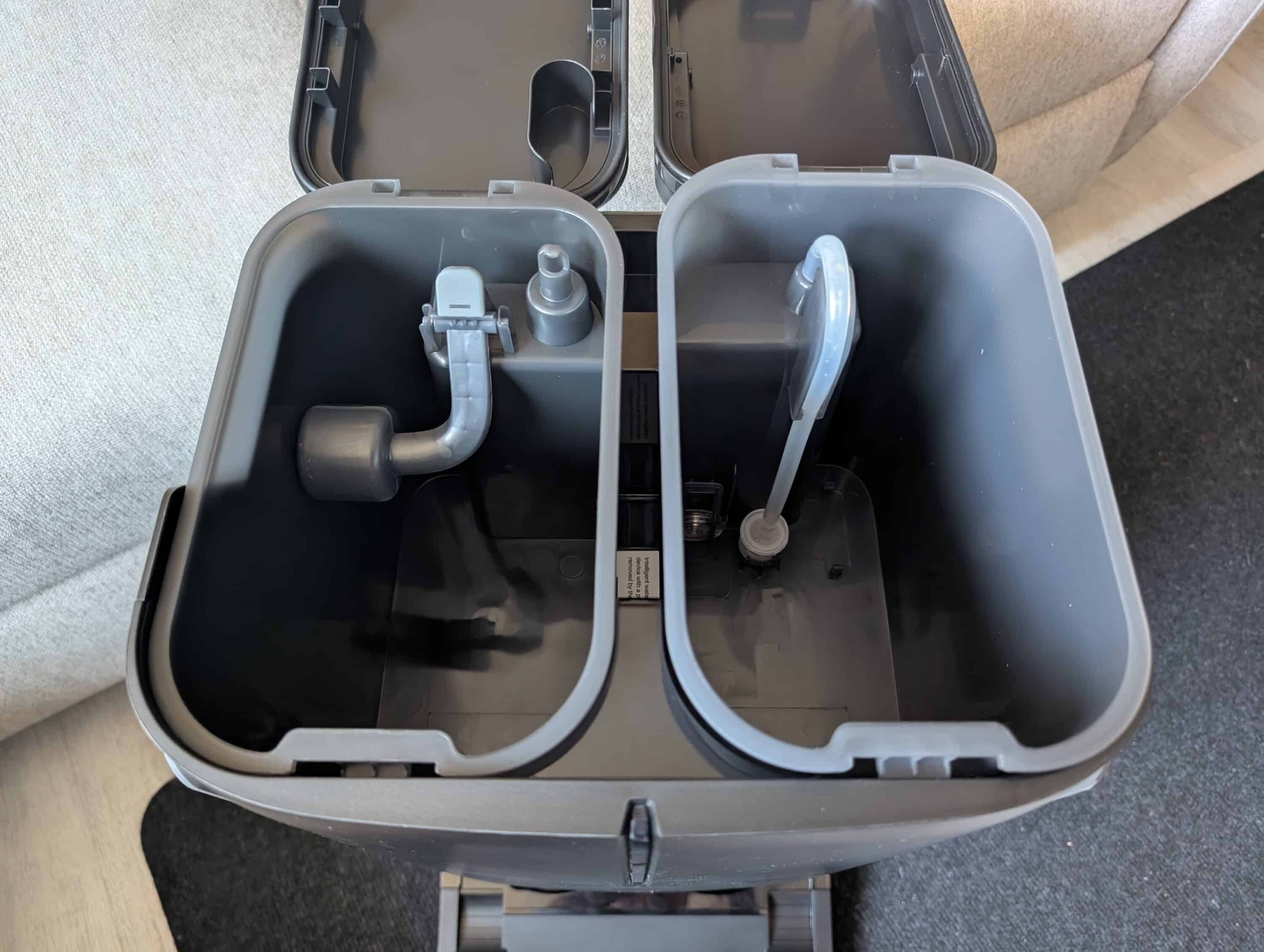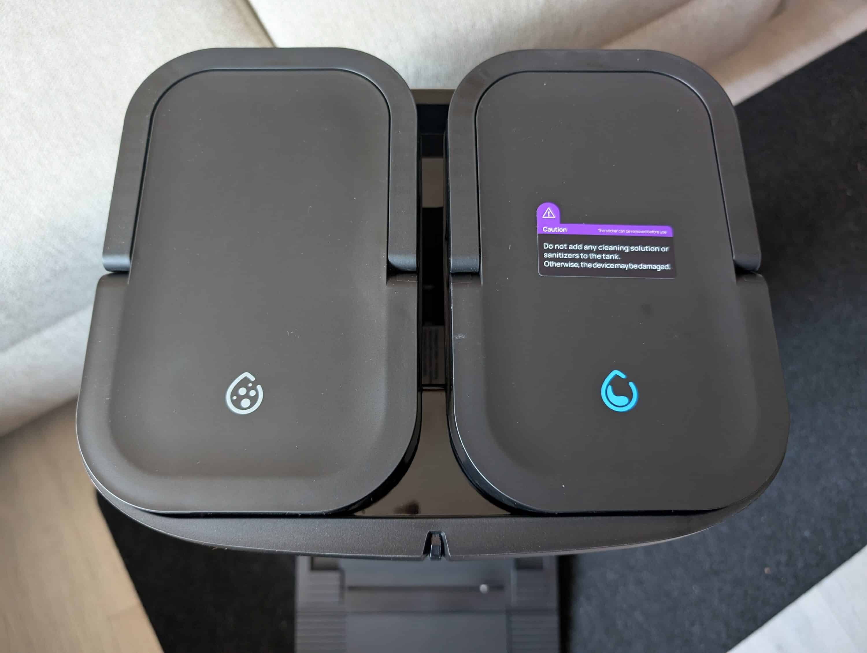 The assembly is really quick: plug in the brush and mops, fill up the fresh water tank, plug in the cleaning agent until it clicks, plug in the power connection and click the retraction ramp onto the base – it takes less than 5 minutes. Everything fits together perfectly and the mechanics feel solid. When setting up the station, you should leave about one meter of space at the front for the robot to maneuver and 50 cm at each side.