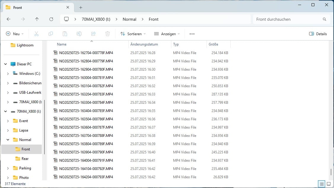 However, if the “Normal” folder, in which the continuous recording is saved, is filled with almost 100 GB, the oldest files are deleted and replaced by newer recordings. The remaining storage space is free for separately triggered recordings that are not deleted. This is enough for quite a while. On the one hand, this ensures that the recordings can run in a loop and, on the other hand, it ensures that the memory card does not fill up at some point. This means that the recordings from the front and rear cameras are saved for a total of around four hours retrospectively.