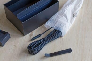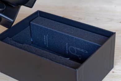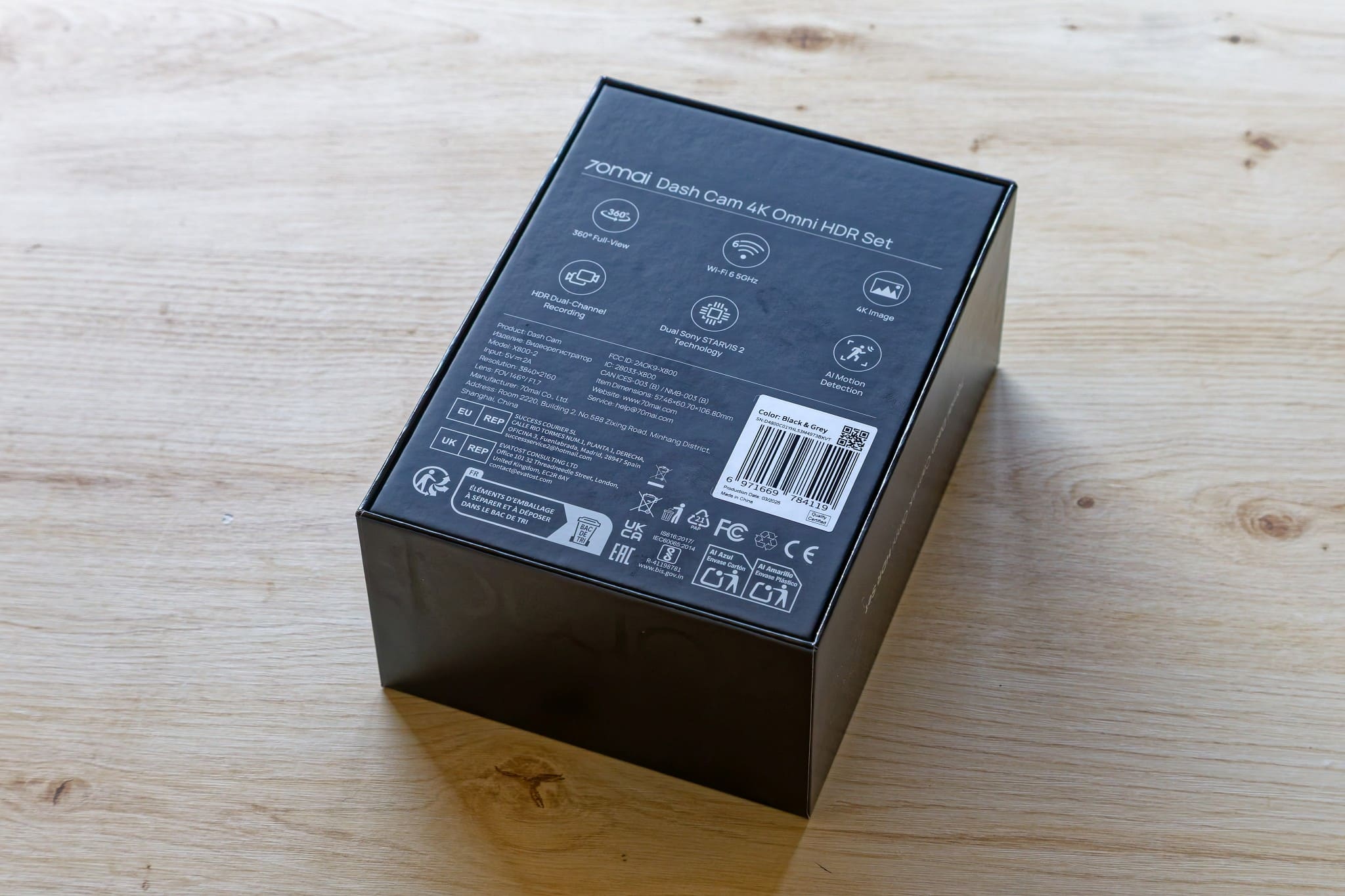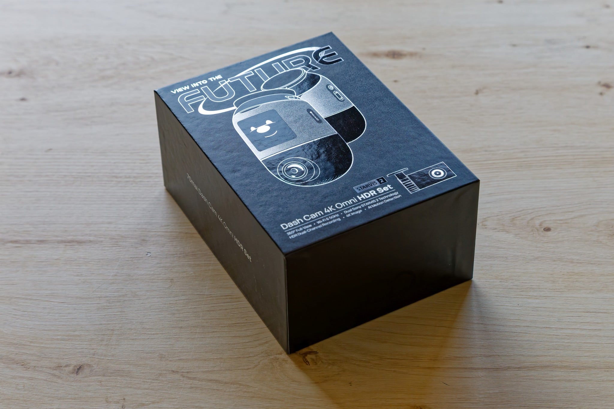 The packaging of the 70mai Dash Cam 4K Omni from this test is quite attractive and robust. The package is shrink-wrapped in a plastic film, under which the solid cardboard is located, which provides good protection. If you remove the top, you can see the two cameras – the large one for the front and the small one for the rear.