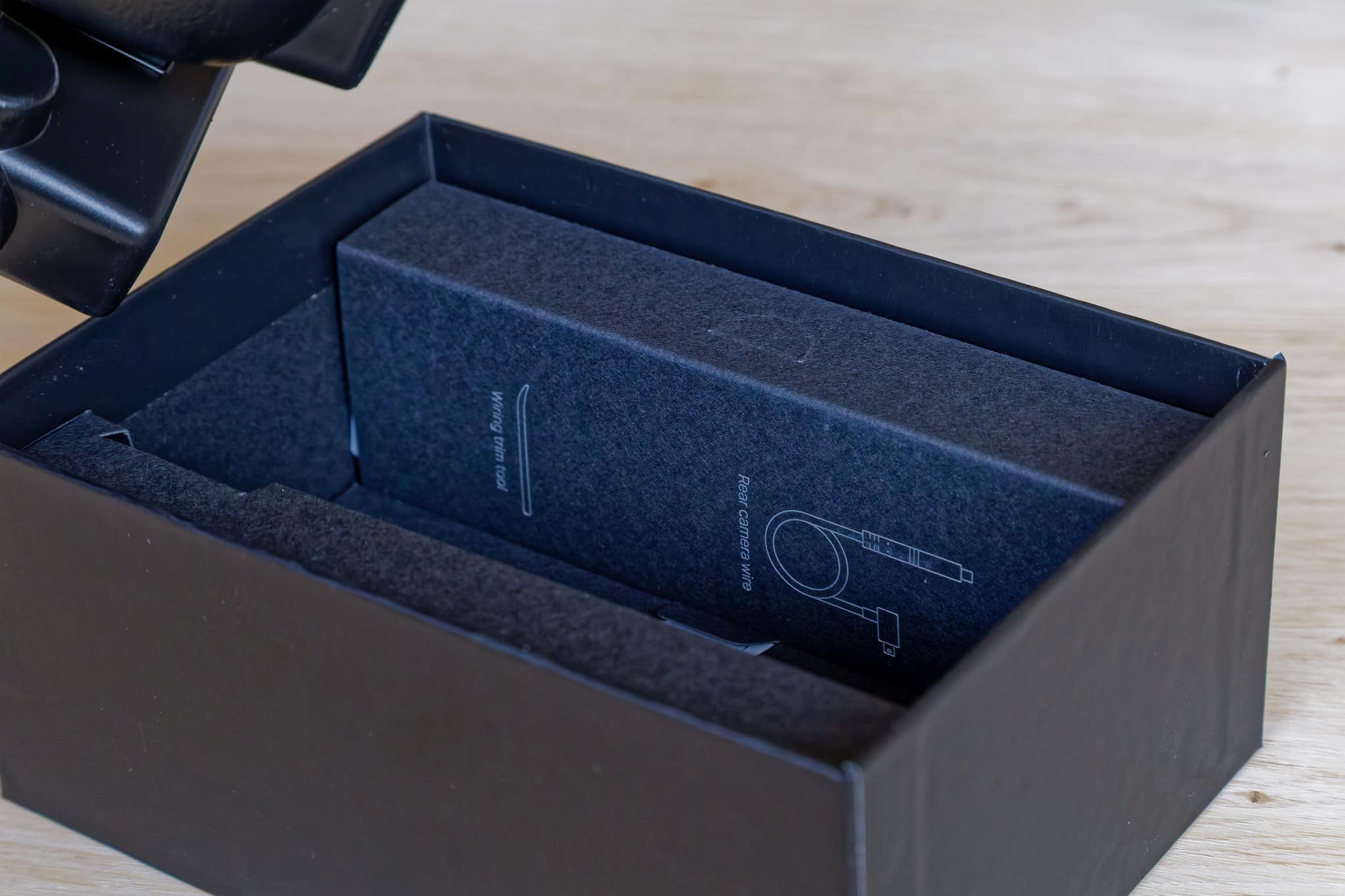The tray in which the two cameras sit can be removed to reveal the accessory boxes underneath. One contains the 3.5 m long USB-A to USB-C cable for the power supply together with the corresponding connection for the 12 V plug for the cigarette lighter. The other box contains the 6 m cable for connecting the rear camera and a tool for lifting the car panel so that the cables can be laid neatly and safely.