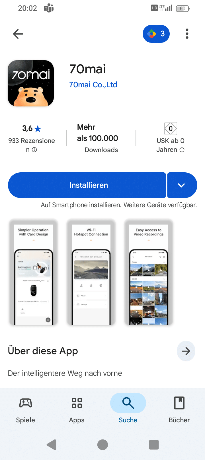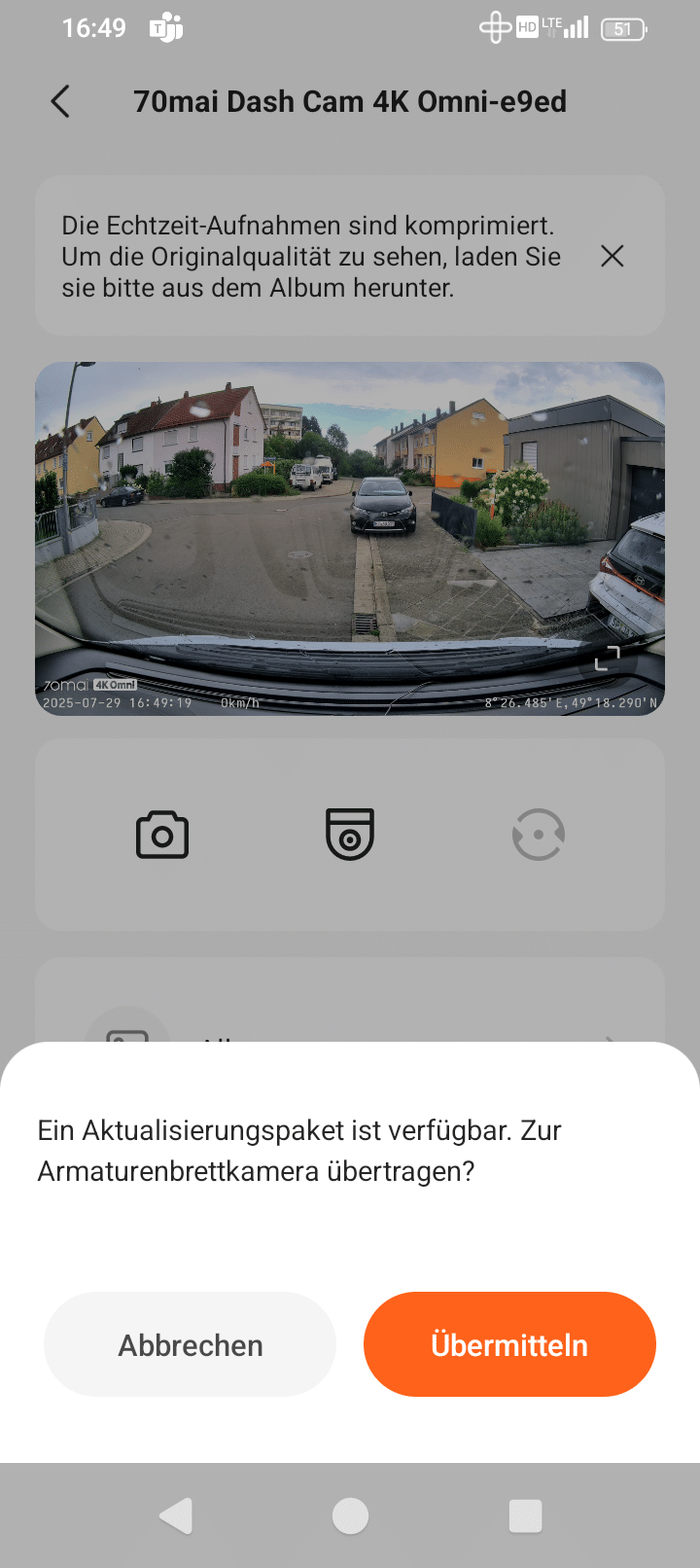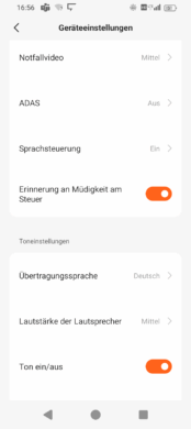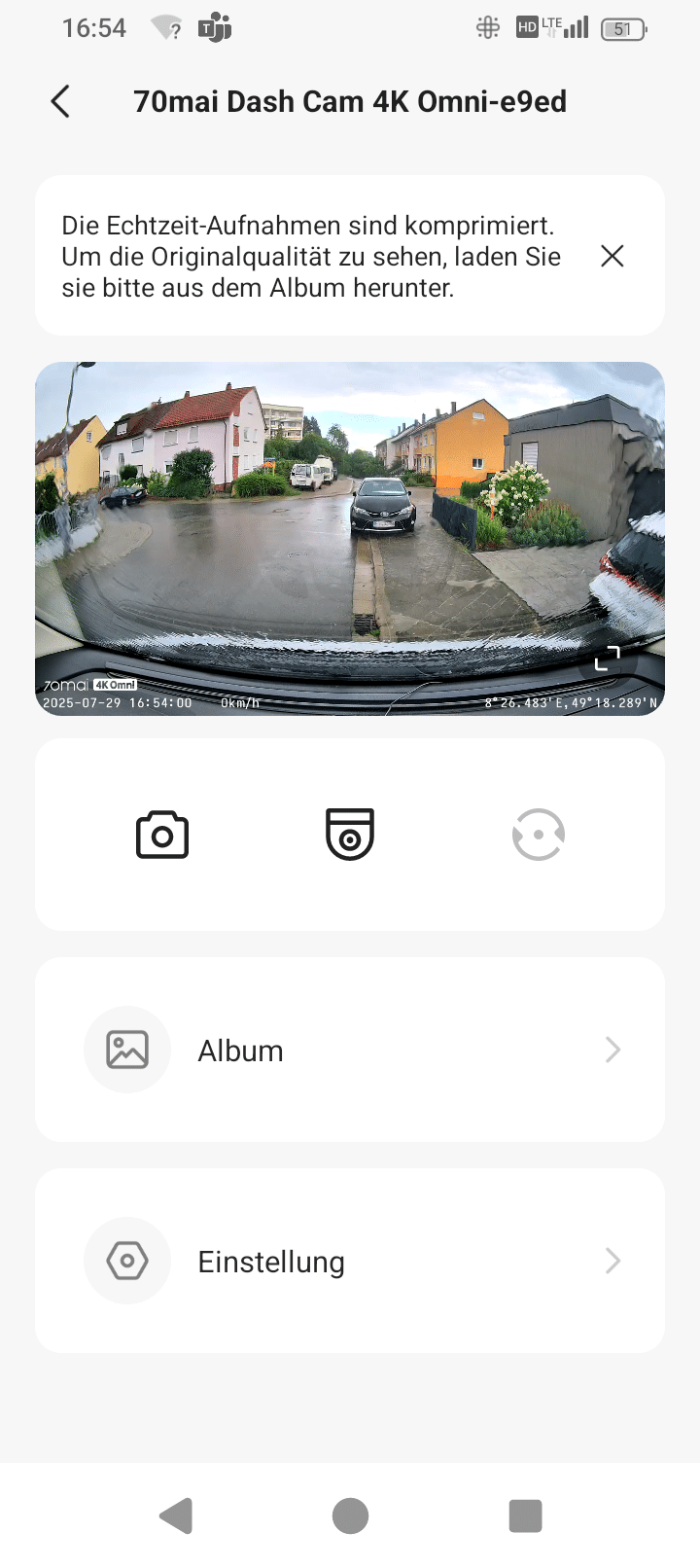 When you are on the start page, the camera view is displayed in small, but there is also an icon for enlarging it. Now you get the full view of the camera image in widescreen – much better than on the mini screen of the dash cam, and also in a decent size and permanently, whereas the 70mai 4K Omni changes the live view to the time relatively quickly.