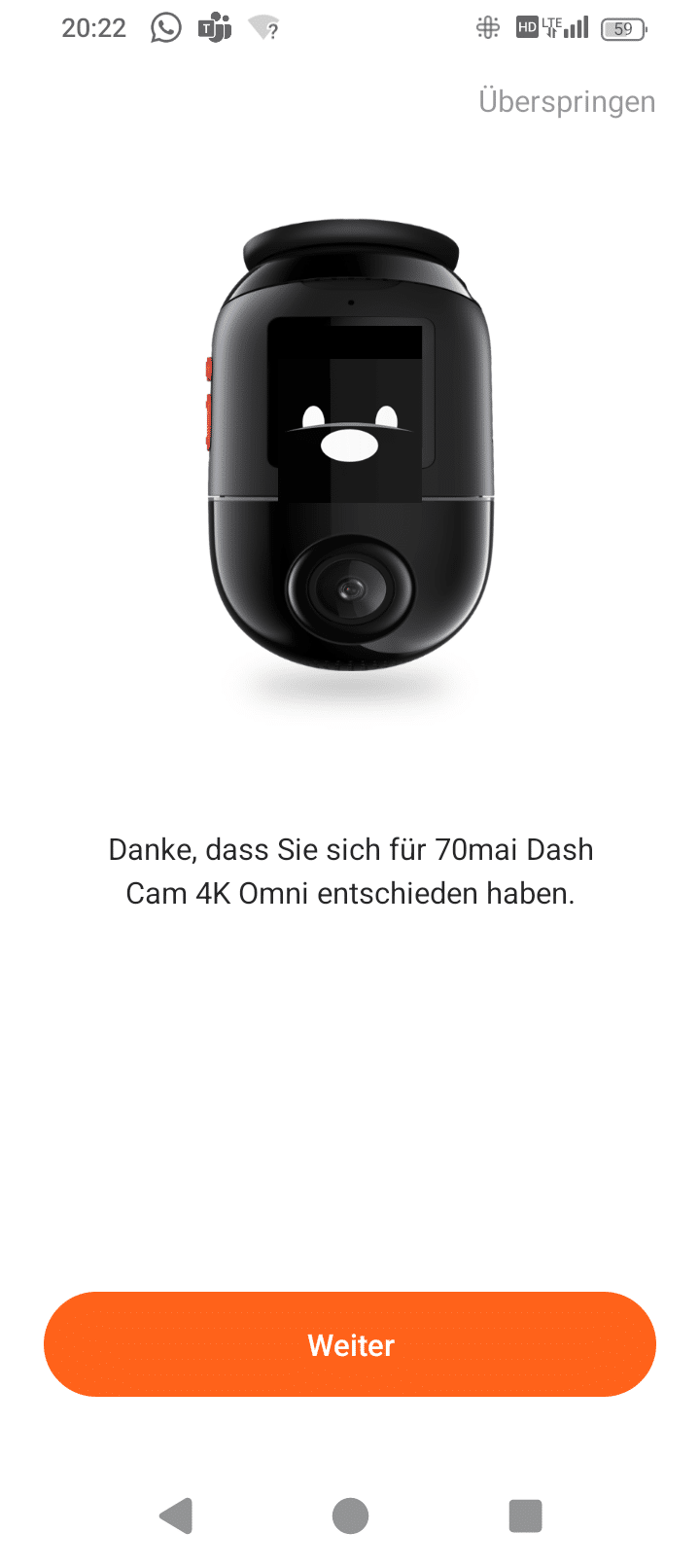When connected to the Dash Cam, the view on the camera also changes to the connection icon in smiley format with a glowing turquoise ring – and now control is completely via the app.