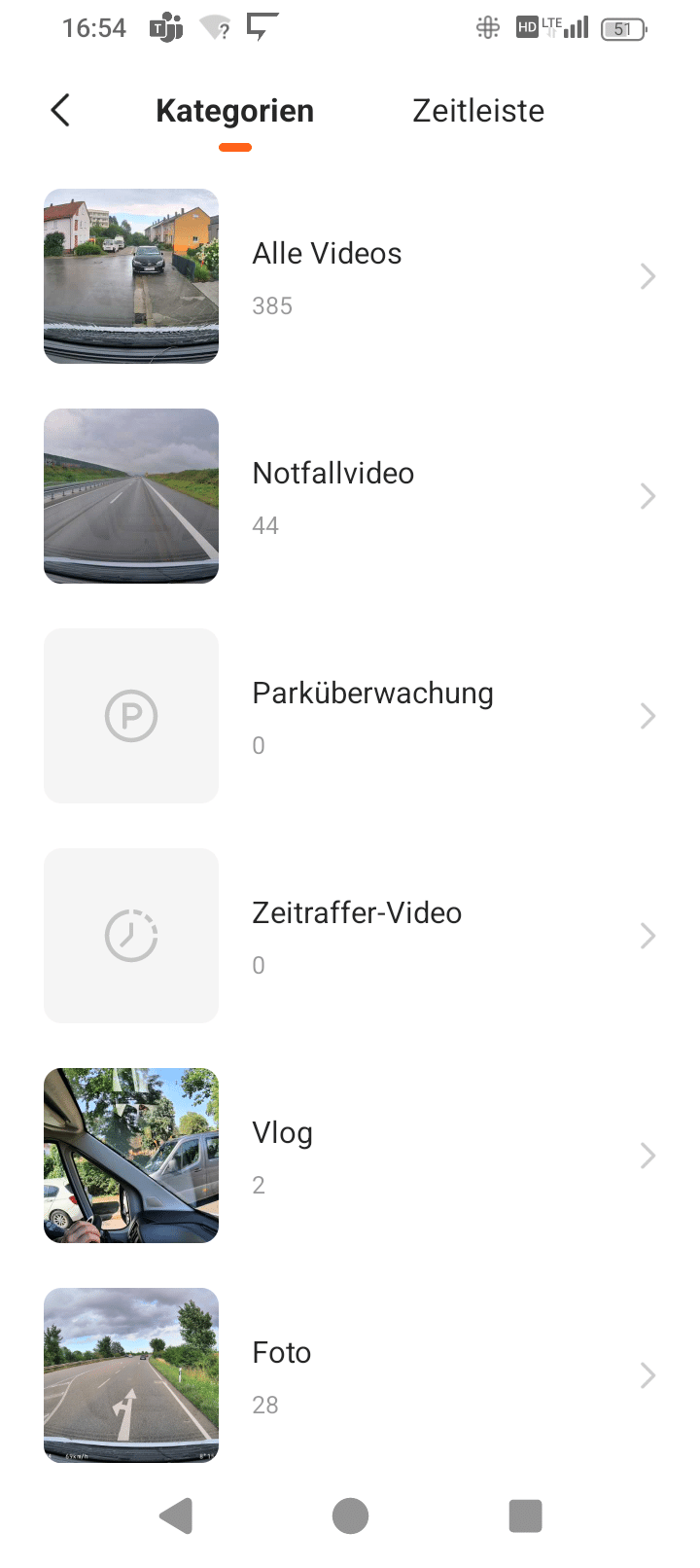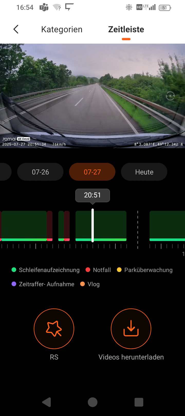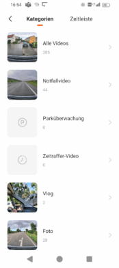 When you open the app and connect to the 70mai Dash Cam 4K Omni, the camera is displayed, including the controls for photos, camera orientation and rear camera selection. You can also access the album and the settings. In the album, you can choose between the individual folders (“Categories”) or the “Timeline”. As the preview in the folders often looks similar, the timeline is good for finding specific shots or events if you know when they took place.