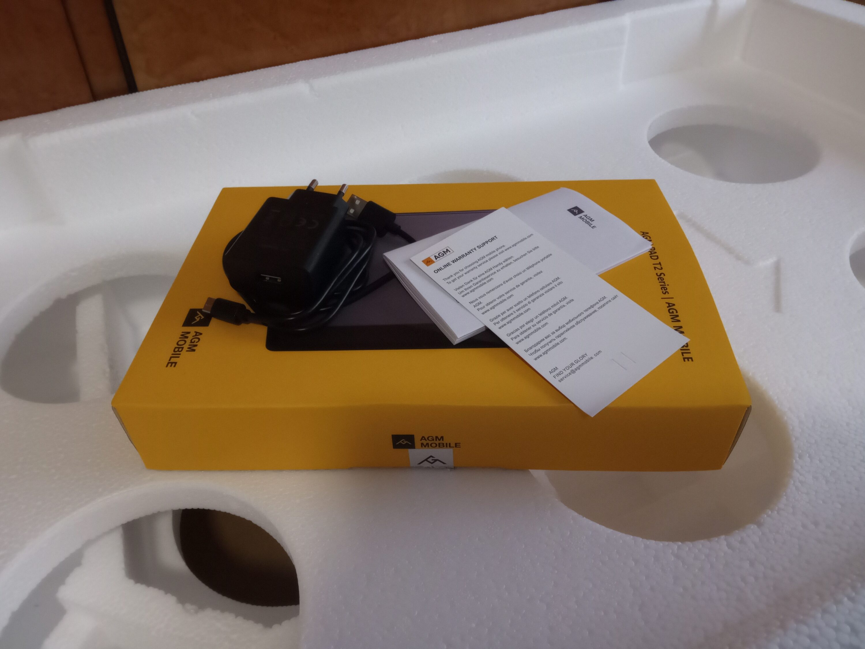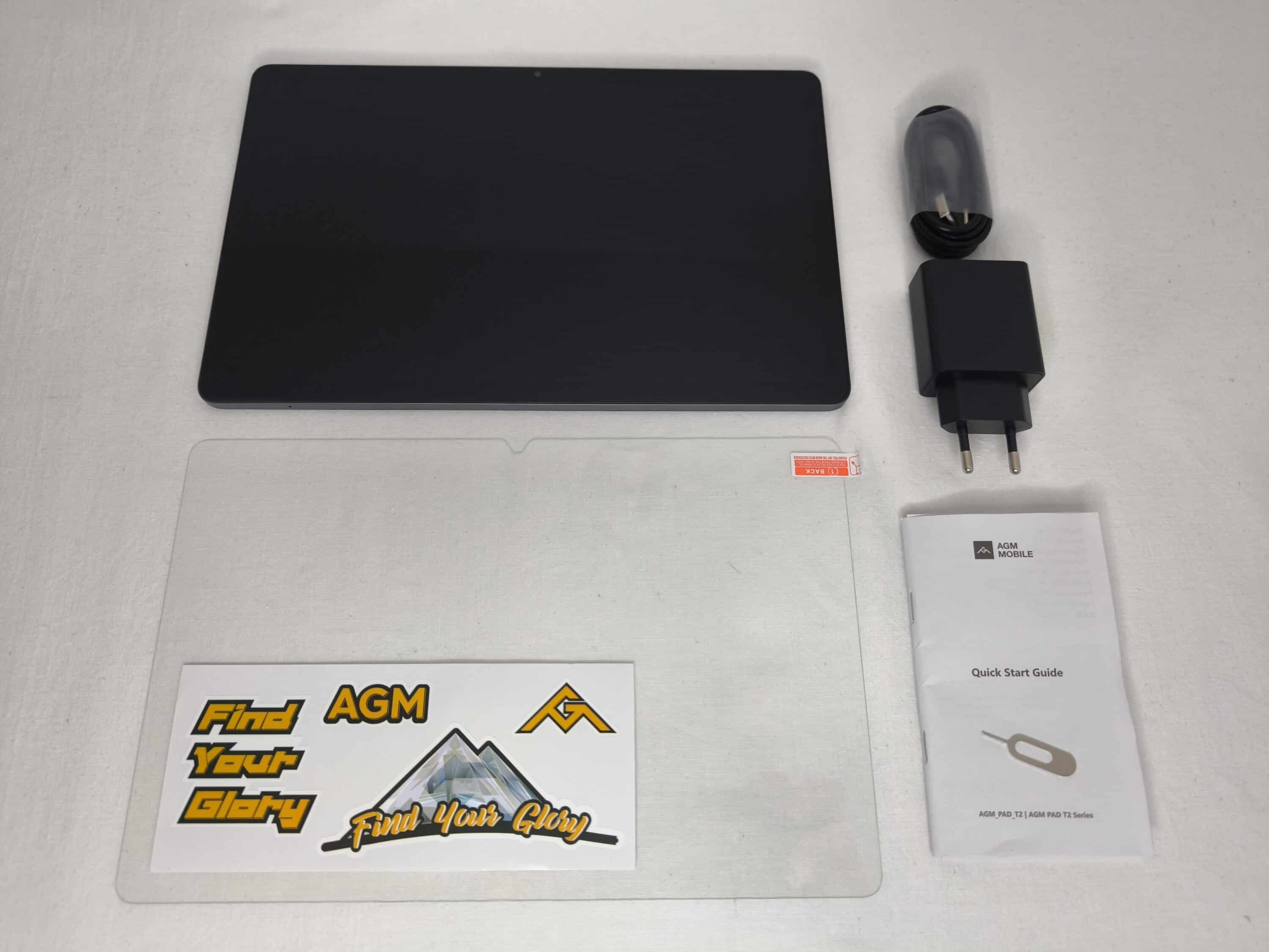 The AGM PAD T2 is delivered in striking yellow packaging. In addition to the tablet itself, the box also contains a protective film and the power supply unit with USB-C cable. The whole thing is rounded off with a few stickers, the operating instructions and a SIM card tool.