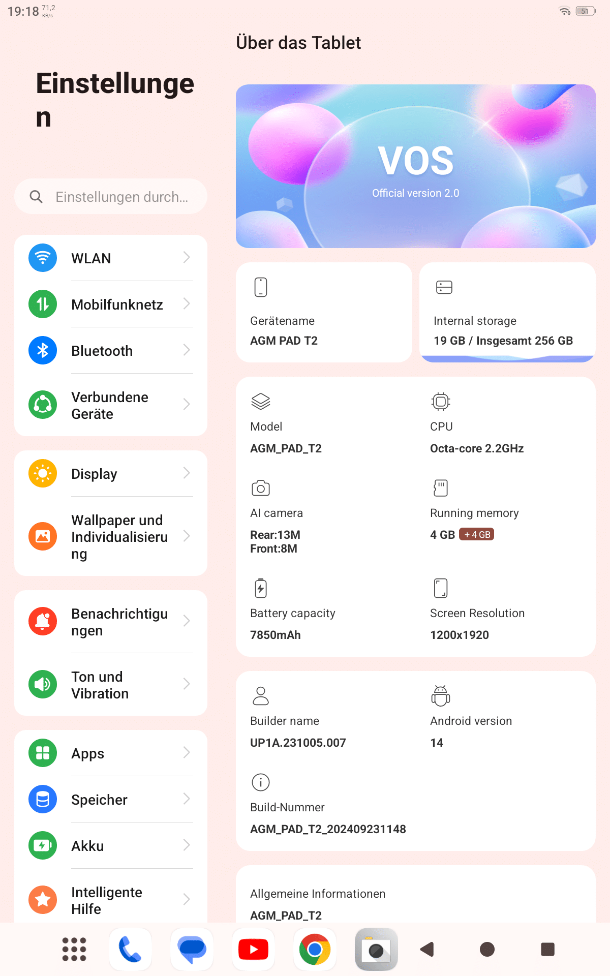According to the technical data, a MediaTek Helio G91 in combination with the ARM Mali-G52 GPU should provide the power under the hood. This seems to differ from our test model that has arrived, which according to several device information relies on a MediaTek Helio G70 or the model designation MT6769. It is therefore possible that our AGM PAD T2 is not yet a final version or the CPU has simply been relabeled, but all of the following benchmarks are based on our current model. Regardless of this, it is an octa-core CPU in both cases. The permanently installed RAM is 4 GB and is increased by a further 4 GB ex works, i.e. to a total of 8 GB.