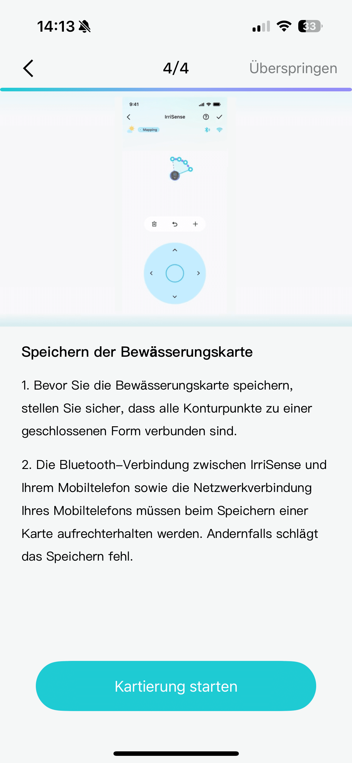 Next, you need to take out your smartphone and download the Aiper app. Here you pair your smartphone and irrigation system and follow the clear step-by-step instructions from Aiper. My smartphone didn’t really want to locate the Aiper via Bluetooth. Fortunately, you can also simply scan the QR code on the back of the device. Once the smartphone and IrriSense have found each other, it’s time for the most important step in the setup: mapping. Here you regulate the range of the water jet step by step and mark the corner points.