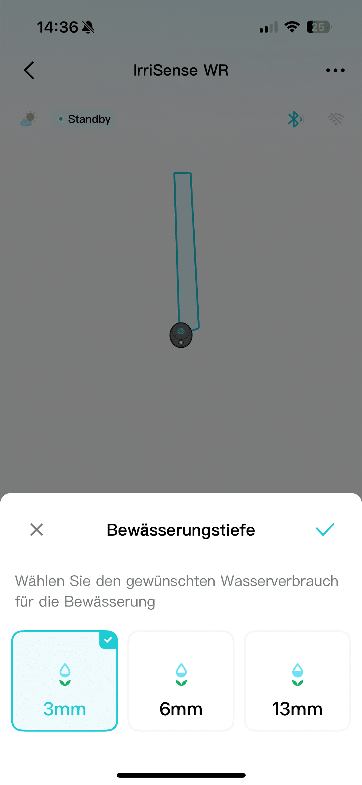 However, the lack of setting options should only bother die-hard irrigation professionals. Personally, I found this to be almost an advantage, as I was able to familiarize myself with the system in no time at all. Operating the Aiper IrriSense is child’s play and almost self-explanatory. You can easily start the irrigation via the app. The app offers a total of three different watering thicknesses (3 mm, 6 mm and 13 mm). You can also set a weekly water consumption limit. The app gives you four different levels to choose from.