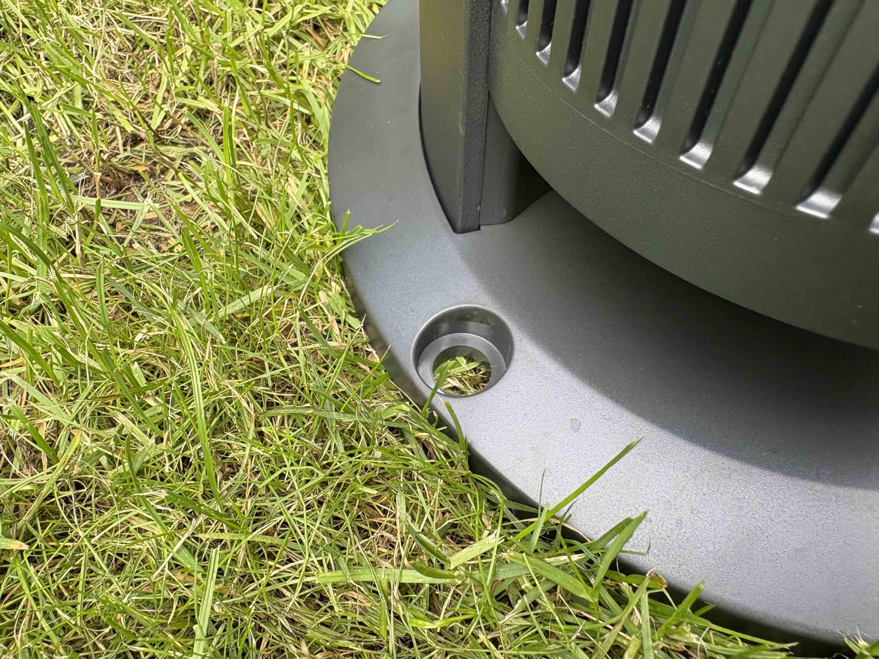 If you look closely, you can see a small, triangular lip here. This is intended to break the water jet in order to send it as far as possible and spread it widely. Underneath is the Aiper logo. The lower half of the cylindrical body of water is characterized by furrows. This is a cover plate that gives you access to the inner workings of the blaster. The base is located at the bottom. Thanks to the pre-drilled holes, you can easily anchor the IrriSense to the ground.