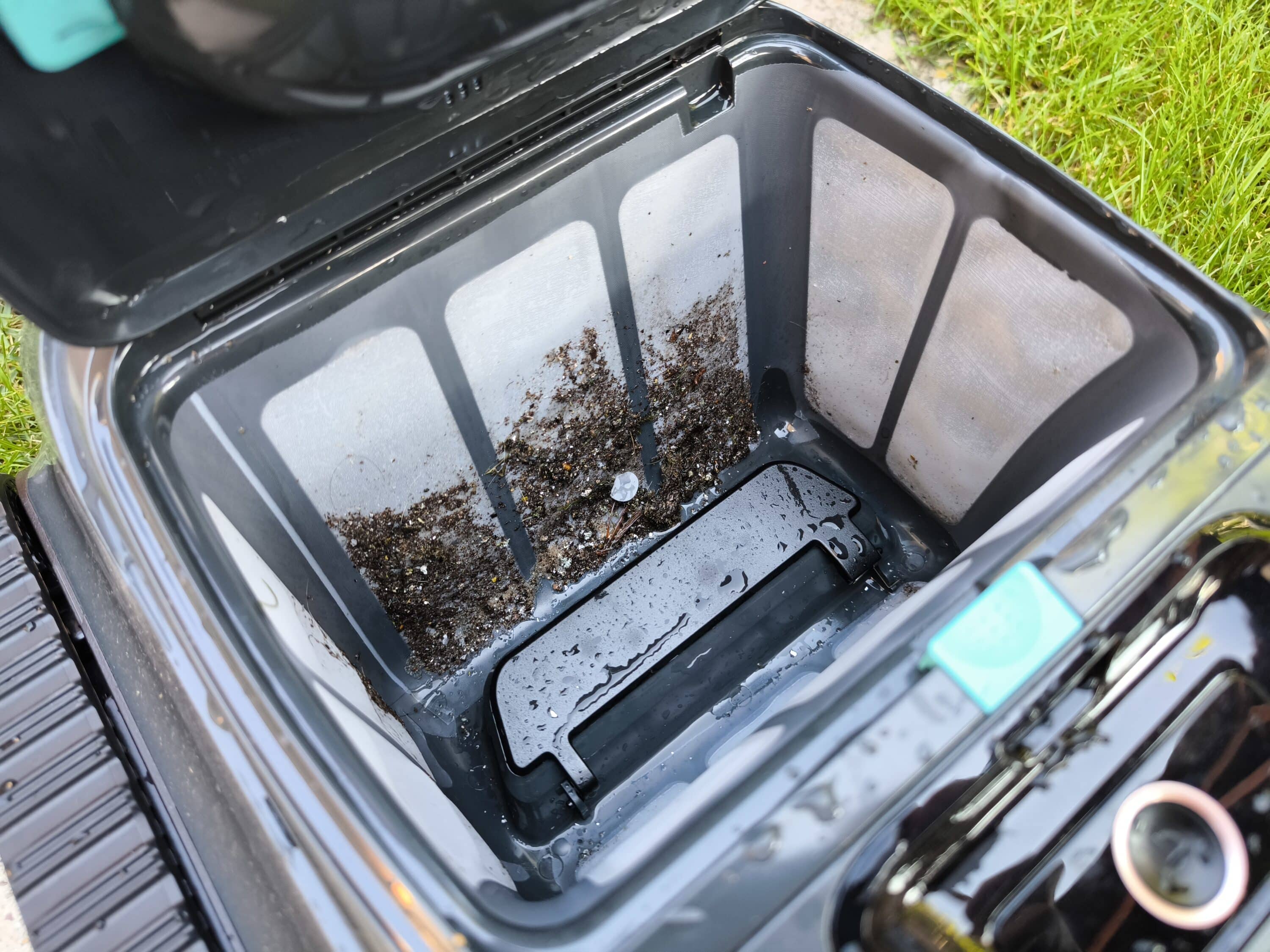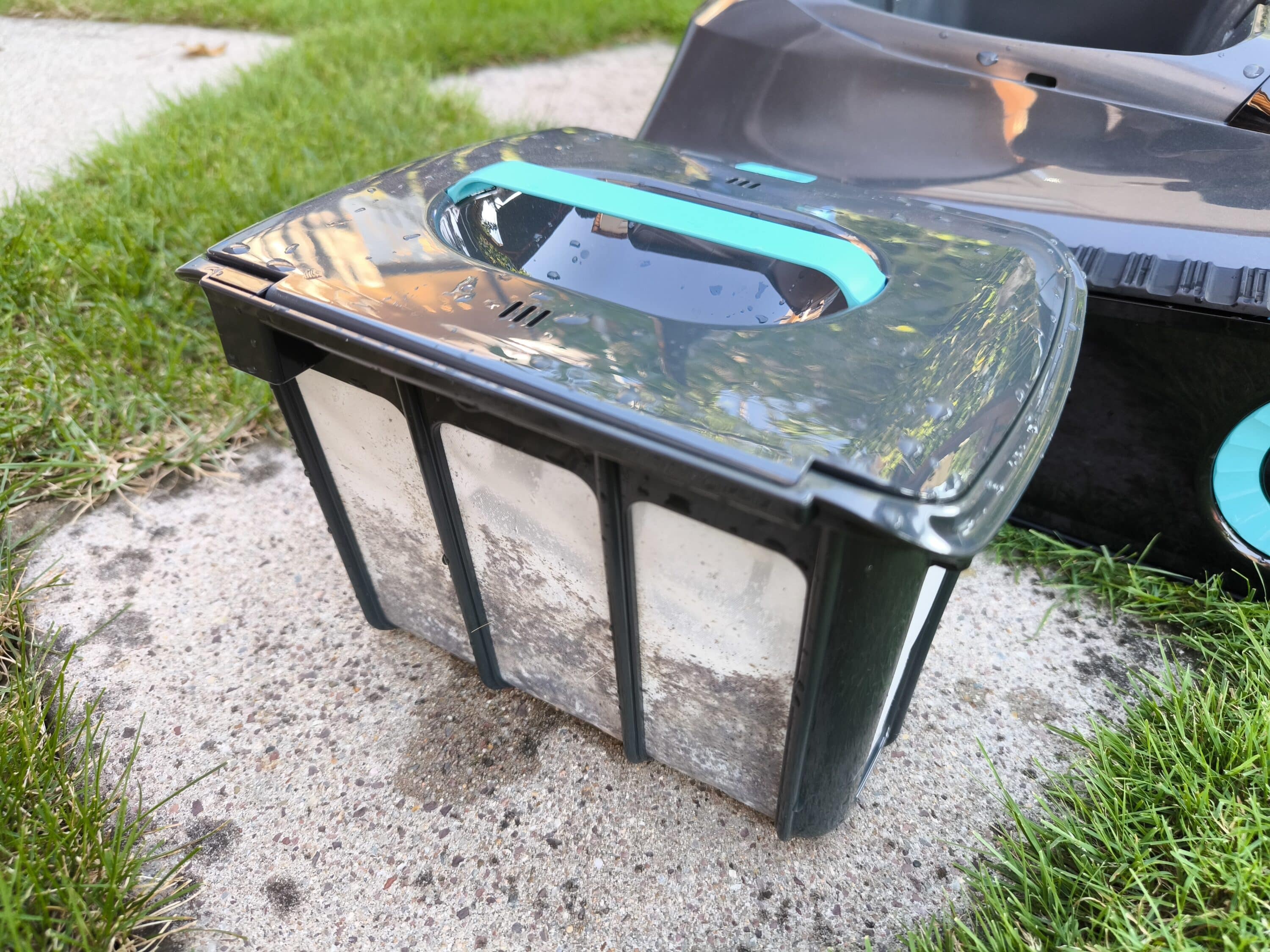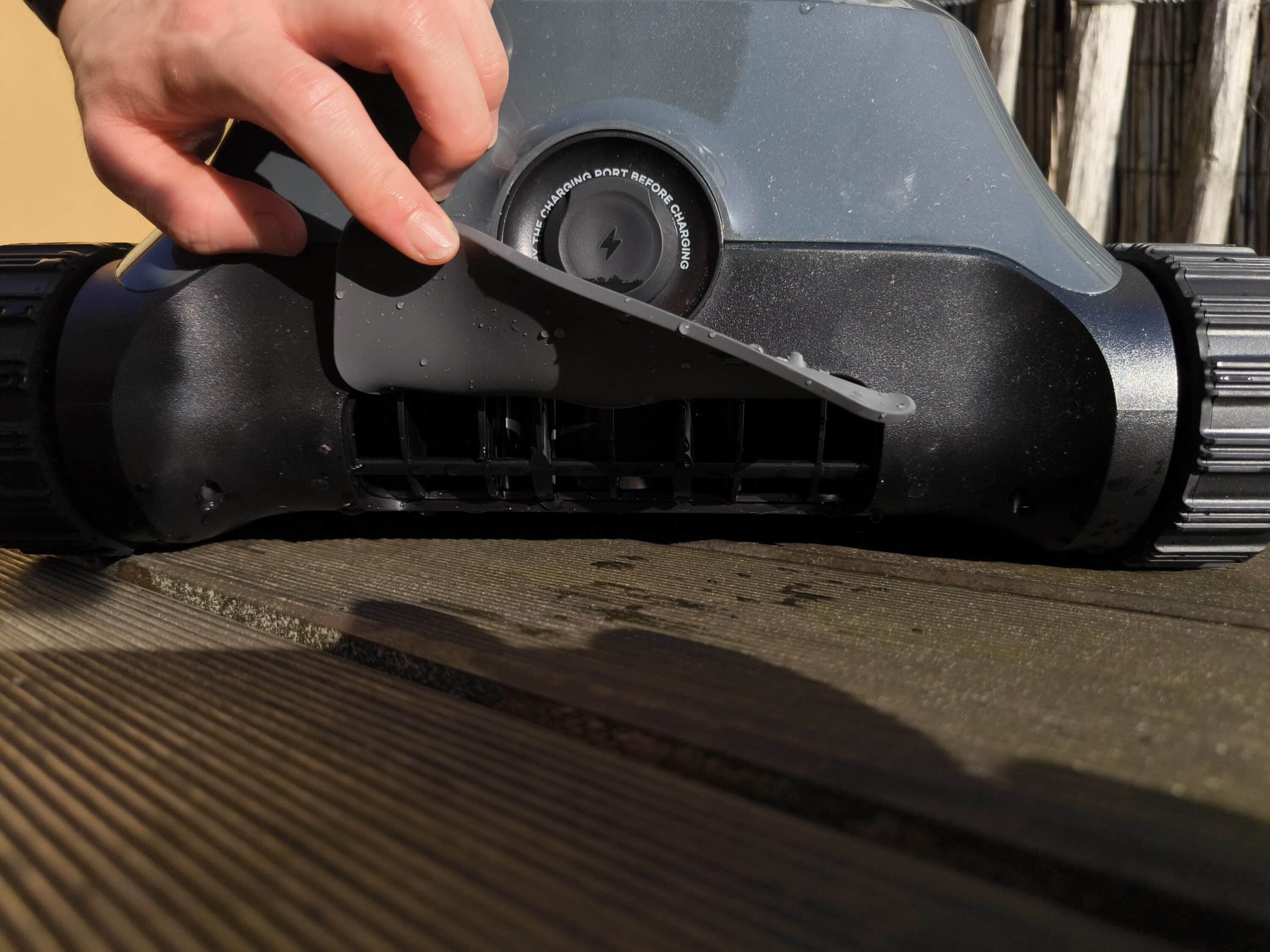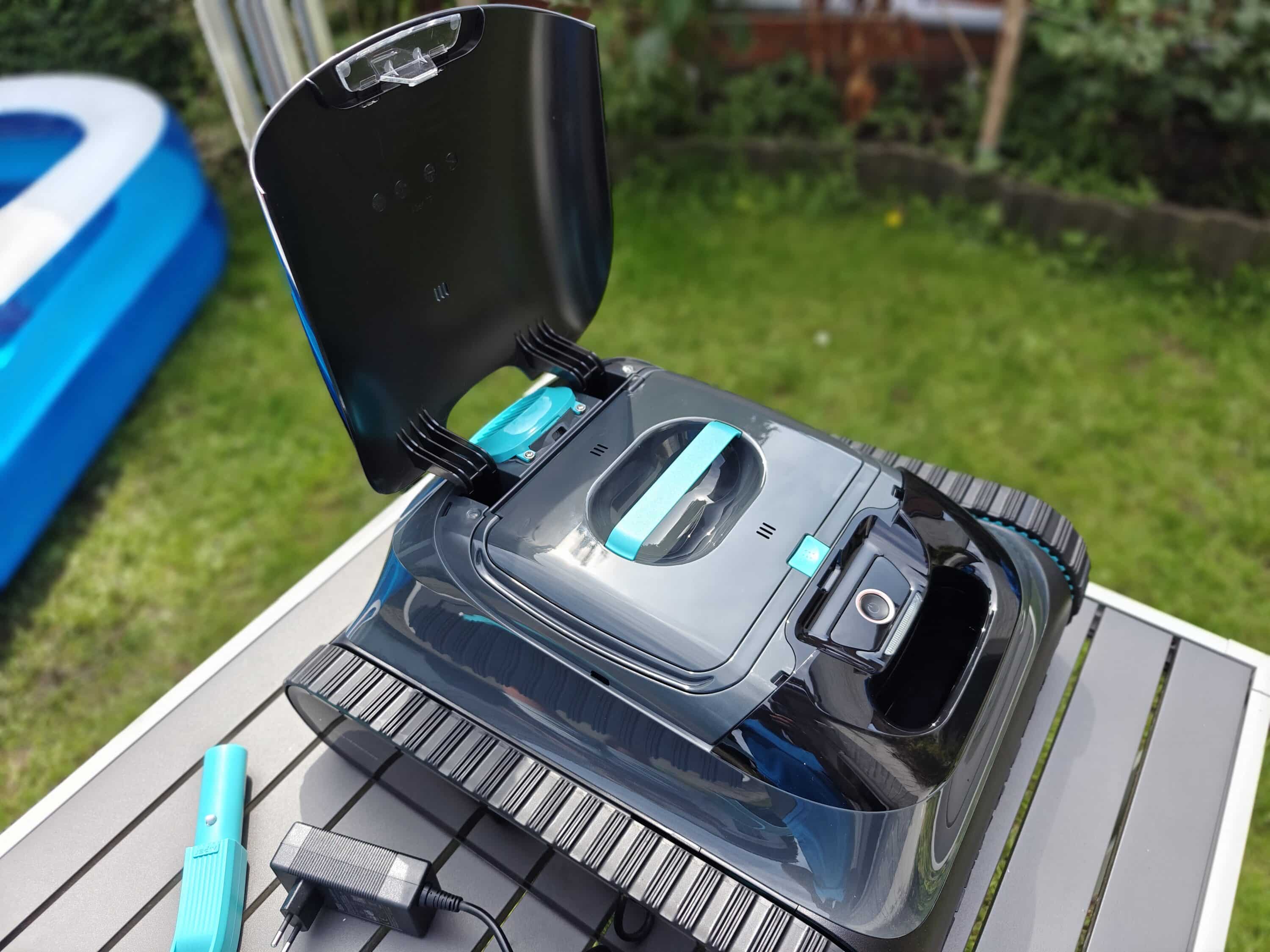 In terms of workmanship, the AIPER Scuba S1 makes a very good impression. All components are solid and firmly mounted so that there are no cracking noises at this point. The Scuba S1 is also easy to operate and is controlled via a single button on the top of the robot. There is also a bright LED bar underneath, which visually displays the current battery status in three levels. The pool vacuum cleaner also scores further points for its opening and closing mechanism, which is user-friendly thanks to a clip button. However, the power supply unit, which emits high-frequency sounds when charging the Scuba S1, does not even affect the robot itself.