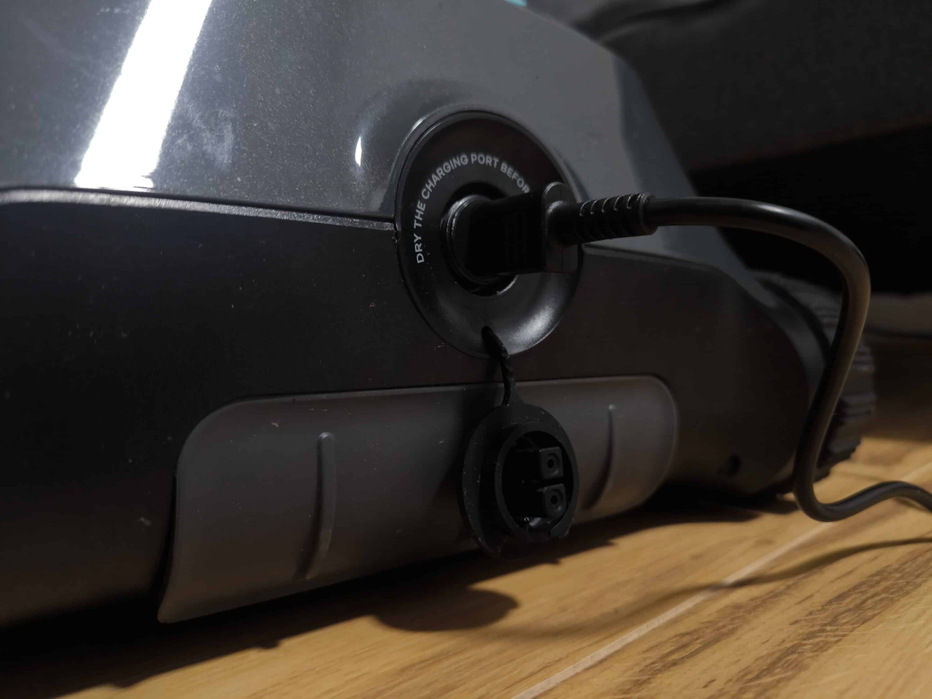 After the first charging process, which can take up to 4 hours, the charging flap is completely closed again with the rubber cover. To start the Scuba S1, simply press and hold the power button on the side of the head. You can then choose between four modes, each of which lights up around the power button. Here you can switch between automatic mode, floor cleaning, wall cleaning and eco mode.
