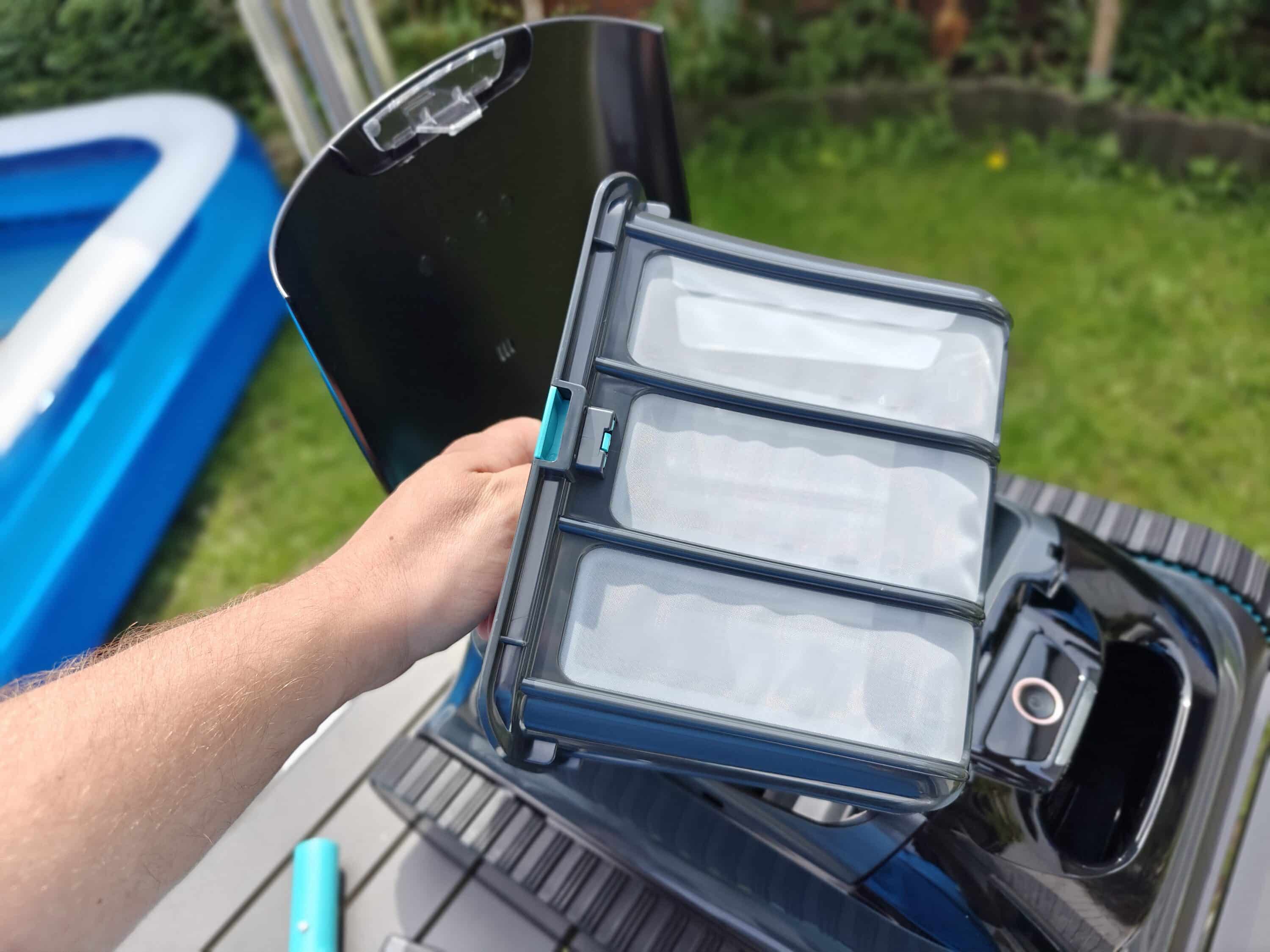 To do this, the lid of the robot must be opened upwards to access the filter basket. The filter basket can be easily pulled out using the turquoise handle. To open the filter basket, the lock must first be removed by pressing the turquoise button.
