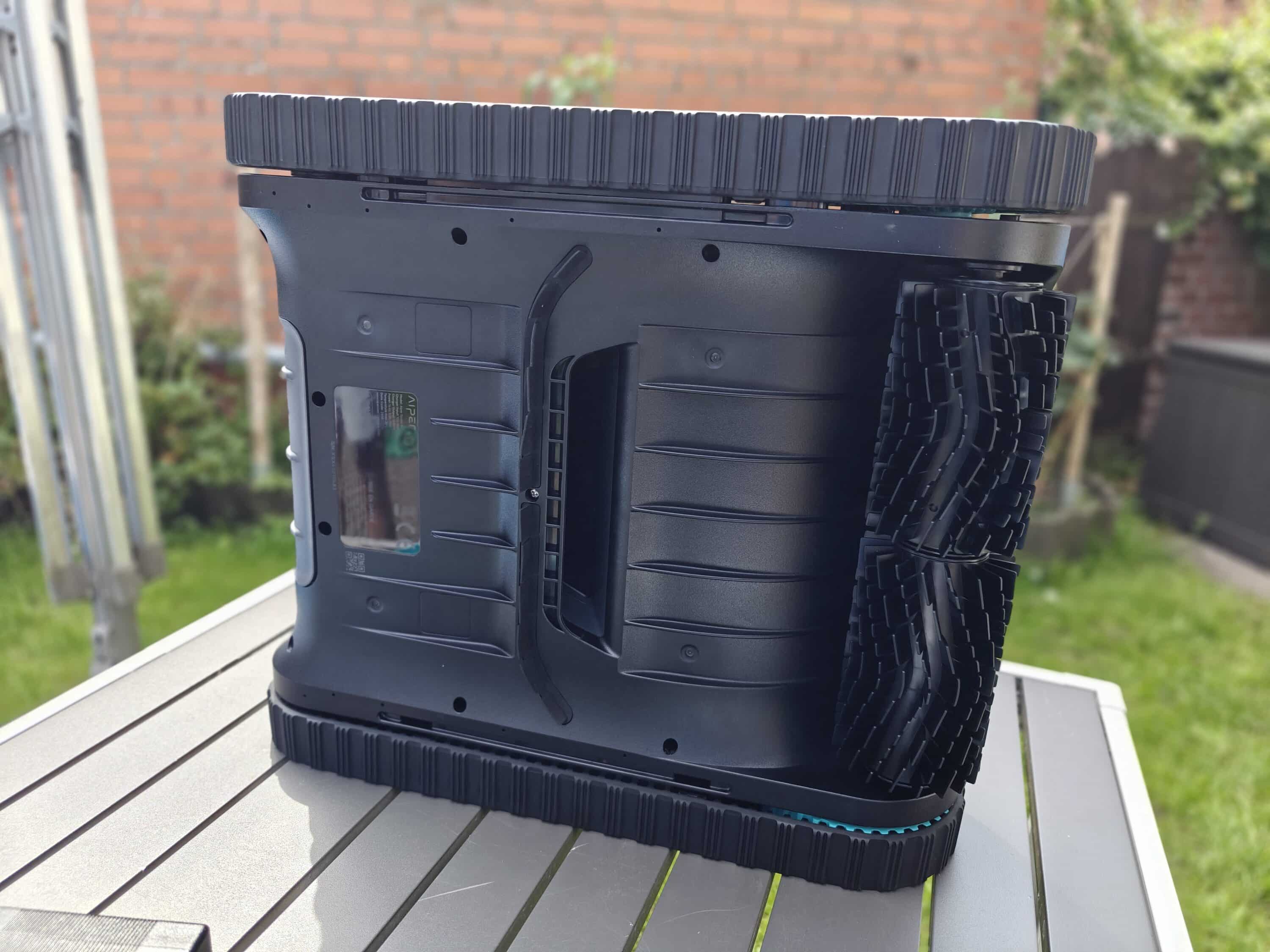Visually, the AIPER Scuba S1 is primarily a flat cleaning robot. Two roller brushes are mounted at the front, while the robot’s charging connection is located at the rear. The sides are each decorated with a caterpillar track with the typical AIPER accents, which end in a turquoise-colored circle at the front. In terms of weight, the AIPER Scuba S1 weighs in at a hefty 7.5 kilograms. This is remedied by the carrying handle of the Scuba S1, which is not routed to the outside as usual, but to the inside of the housing.
