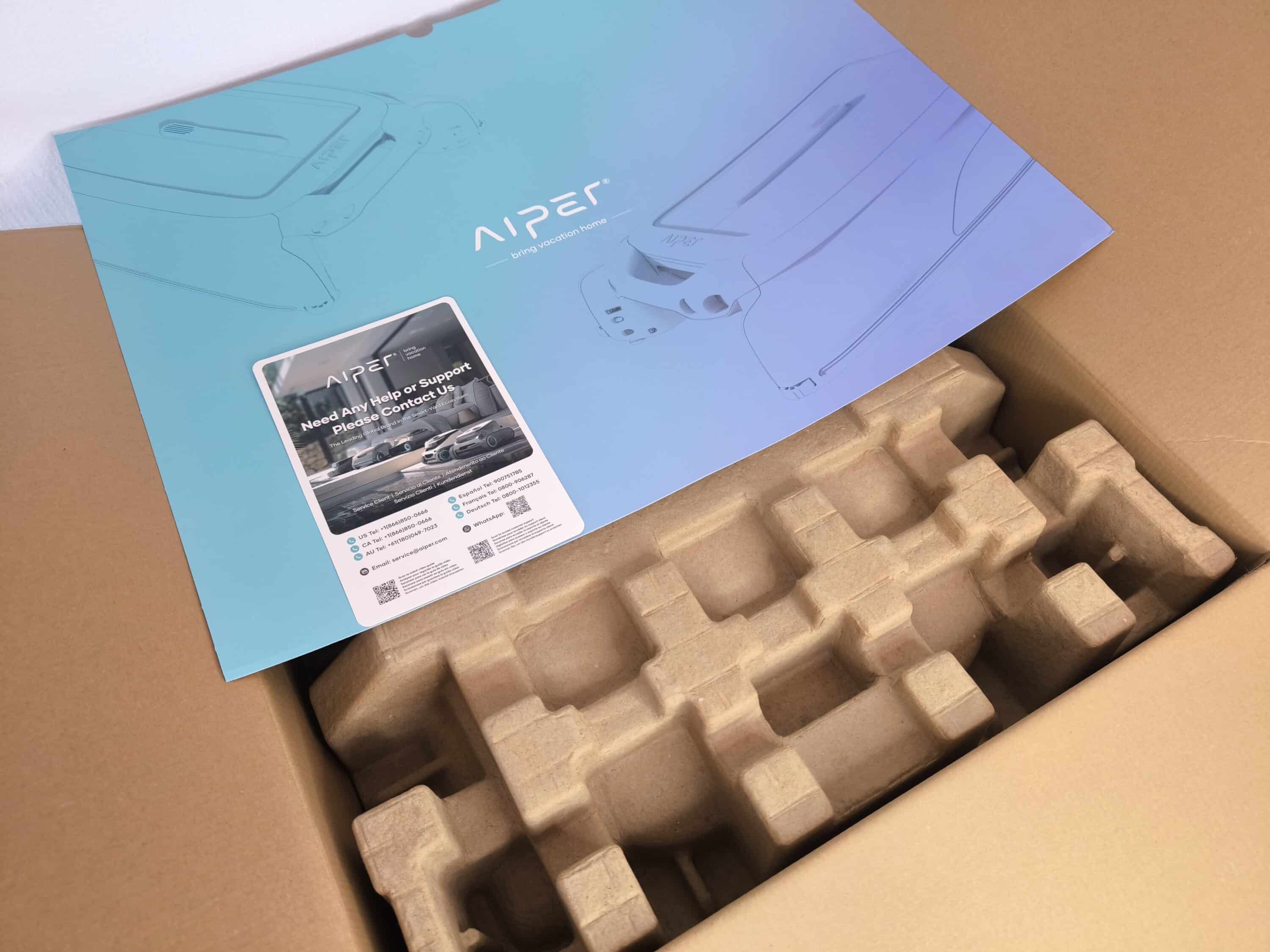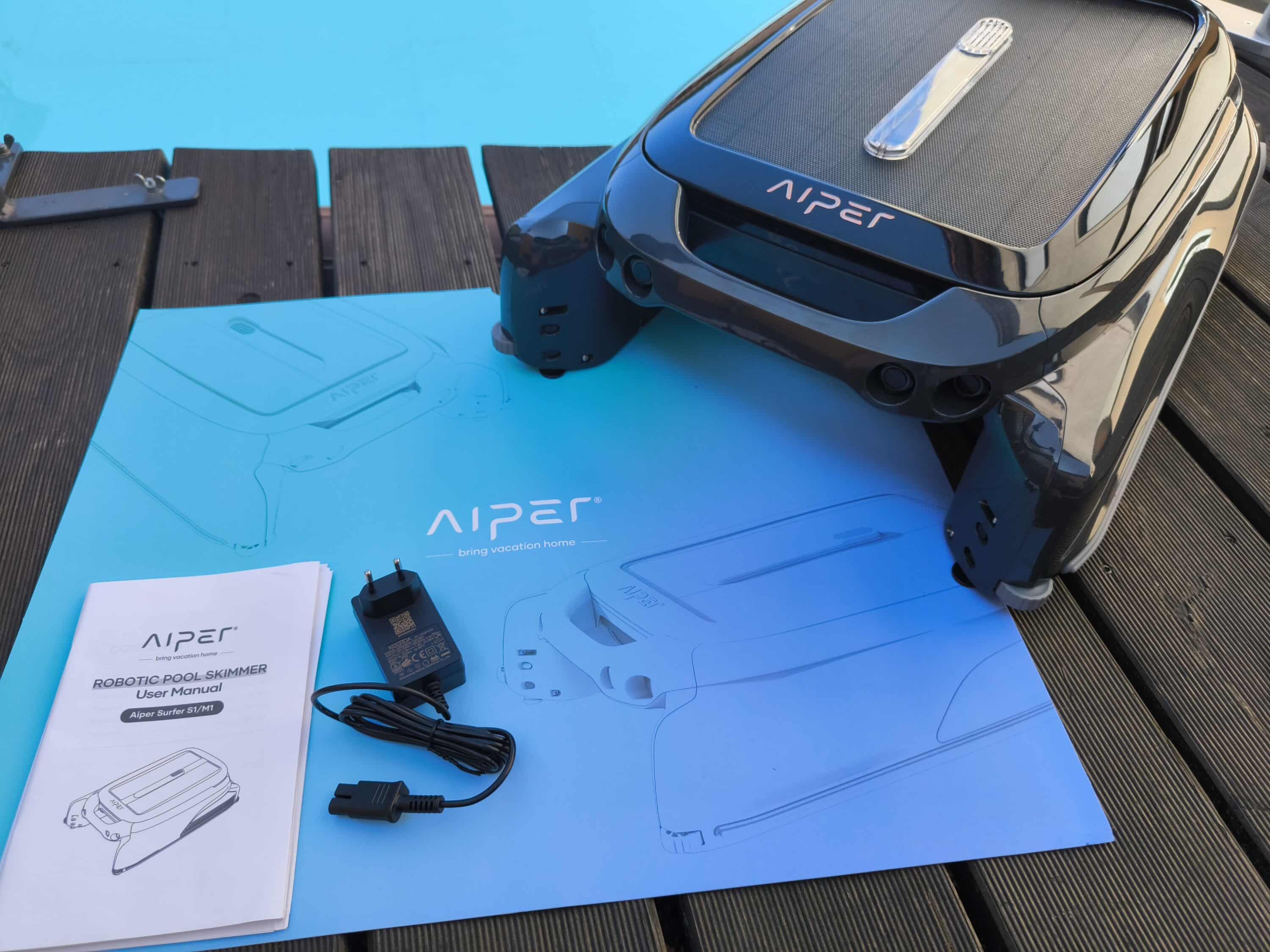 The scope of delivery of the AIPER Surfer S1 can be summarized without much ado: It is limited to the essentials. This includes the pool robot itself and the power supply unit. The usual documents, including the operating instructions, are contained in a separate turquoise envelope.
