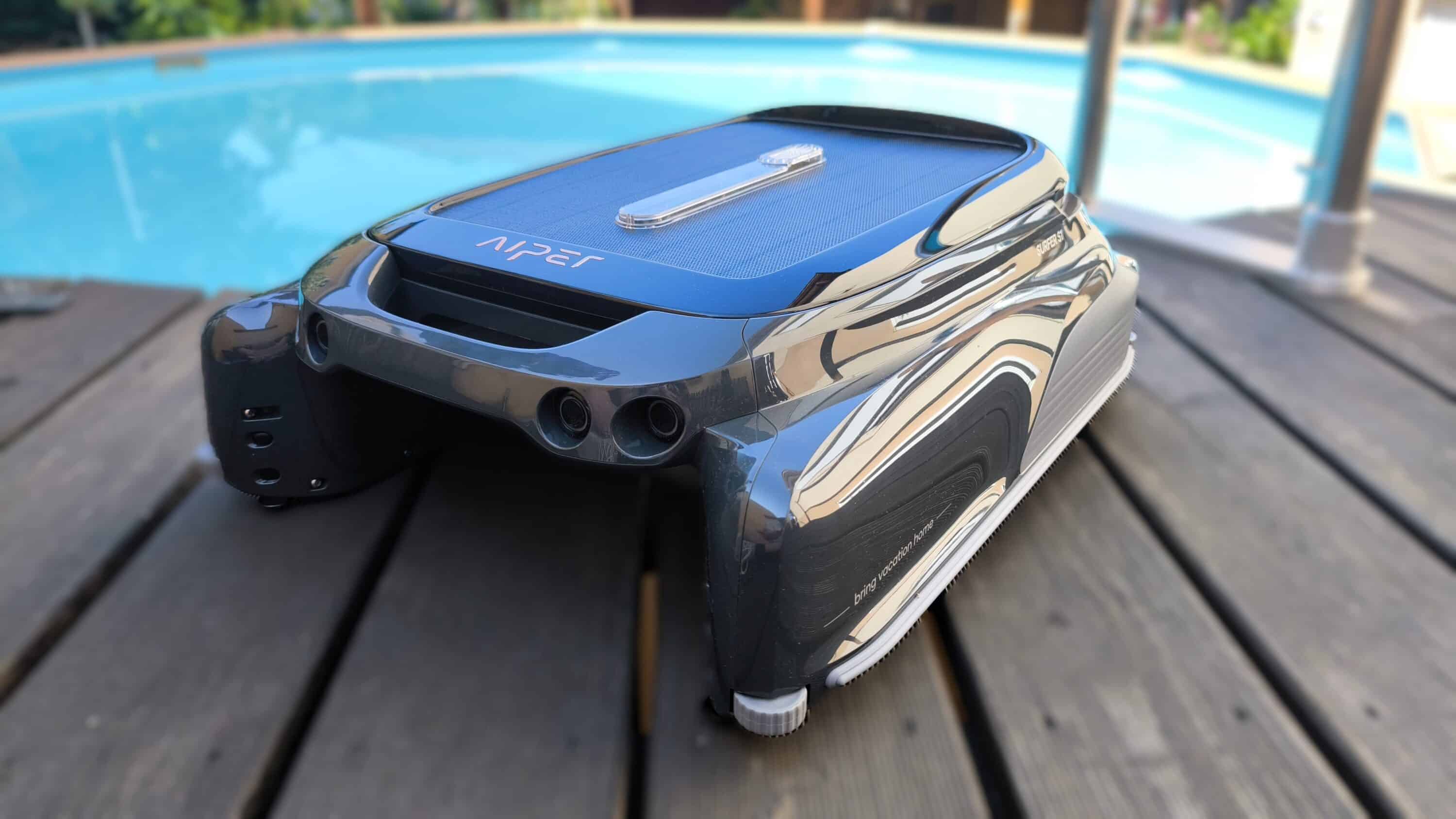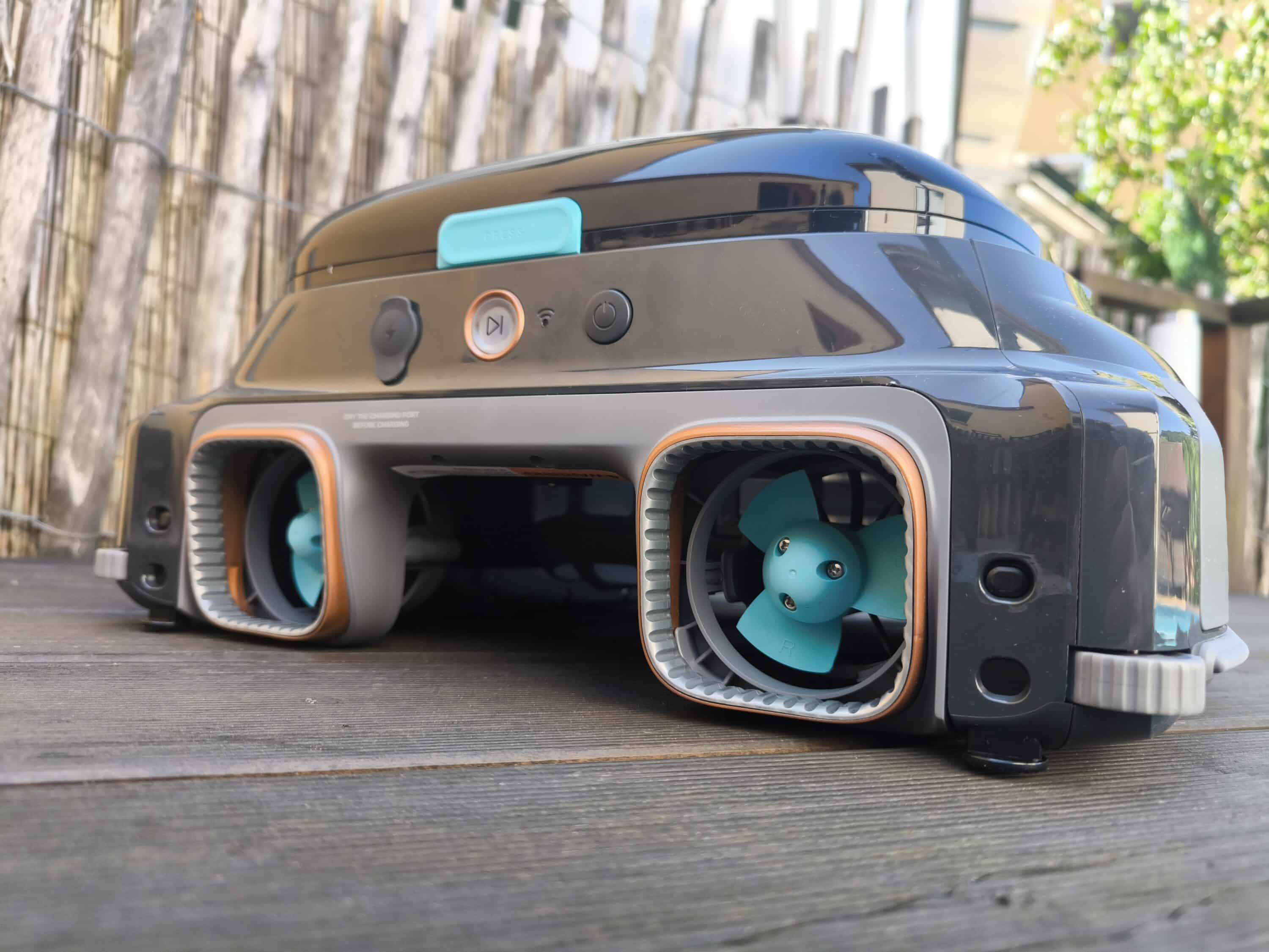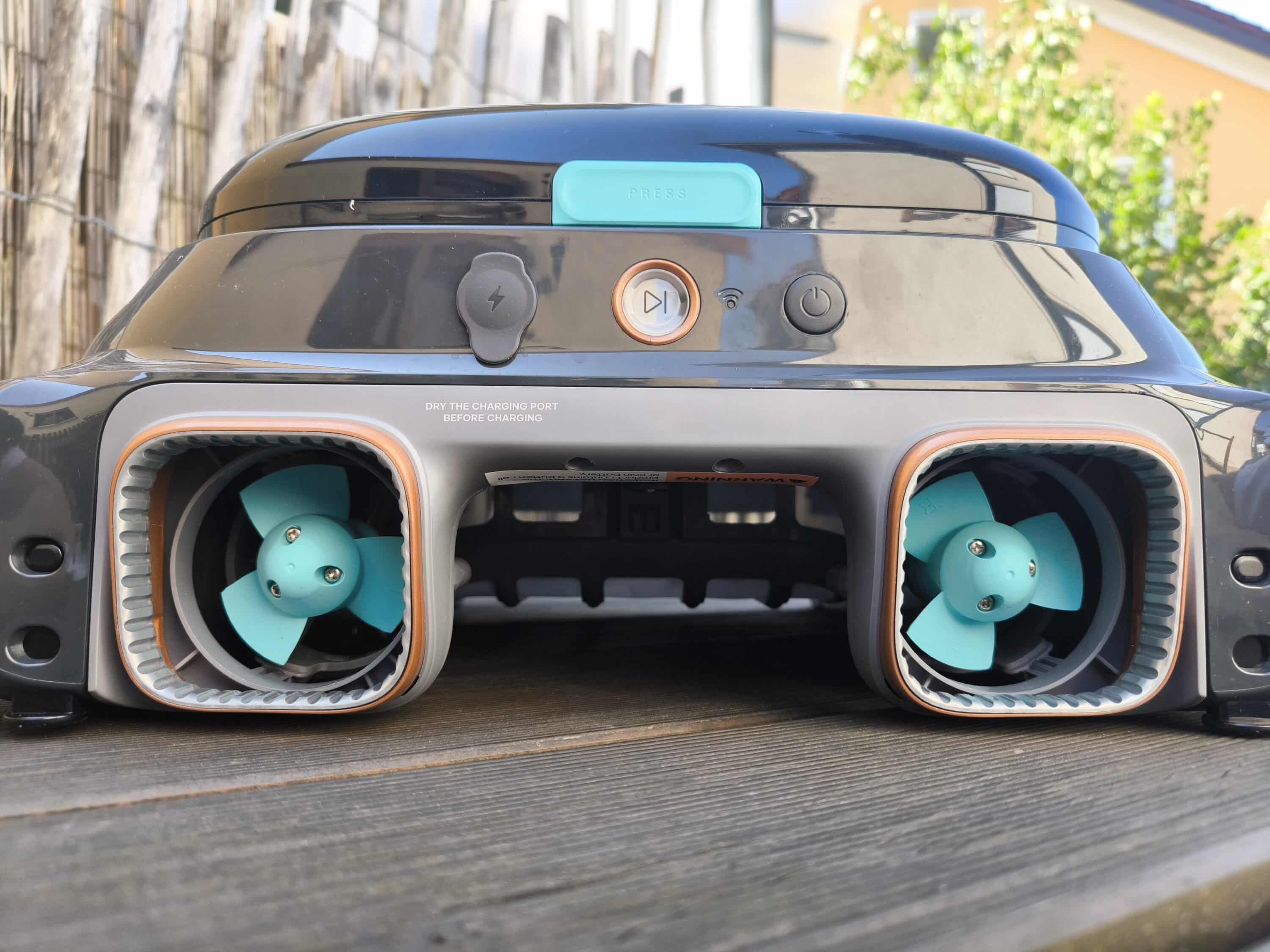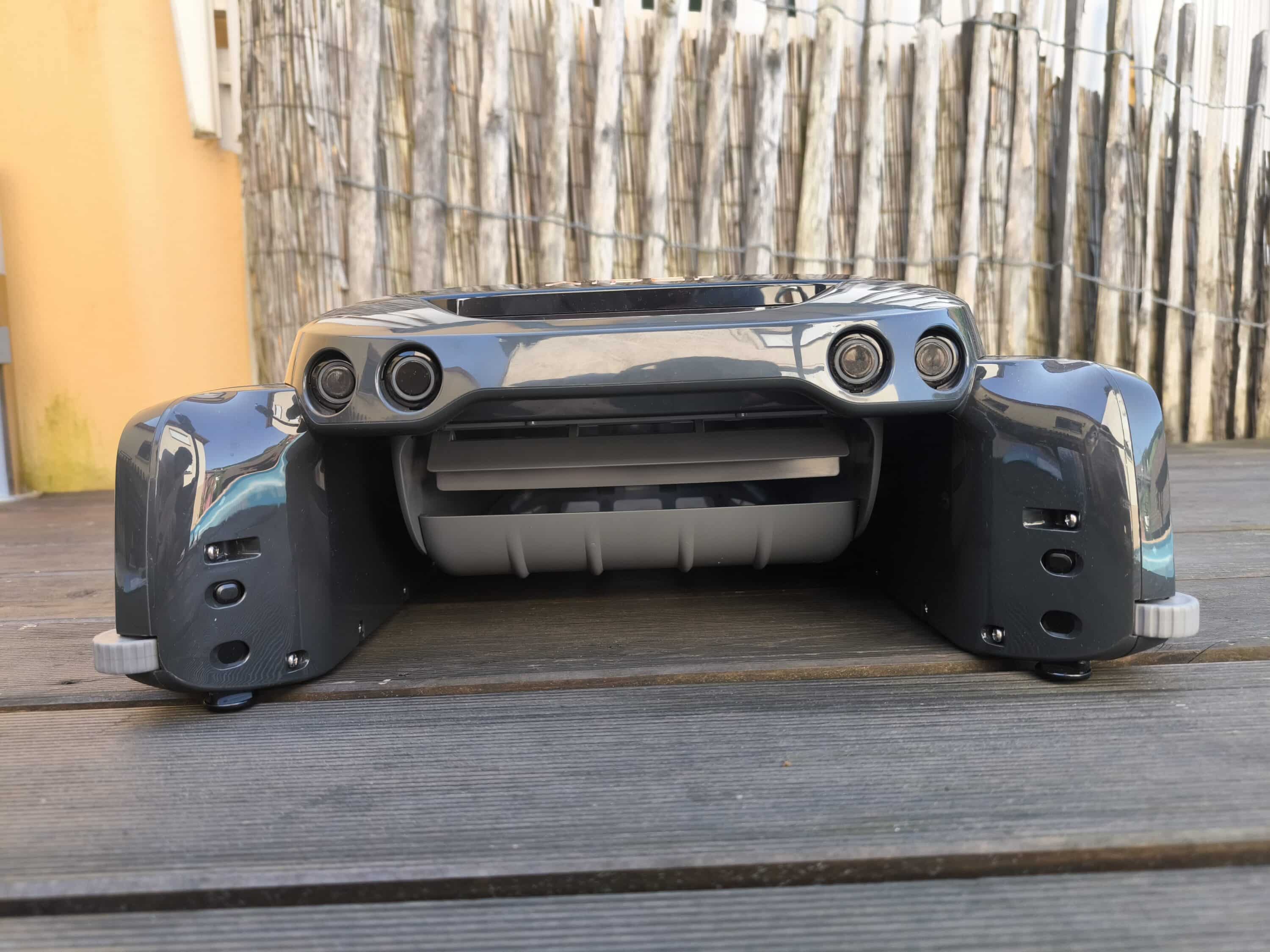 In the world of pool robots, the AIPER Surfer S1 has an extraordinary look. It resembles a catamaran. A large part of the extendable cover is fitted with a solar panel that automatically charges the robot during operation. The front of the cover is adorned with bronze-colored AIPER lettering. The AIPER Surfer S1 is also equipped with ultrasonic sensors for obstacle detection. These are visible on the front in the form of eyes. The controls and charging port are located on the back. Below this, two turquoise propellers ensure the robot’s locomotion.