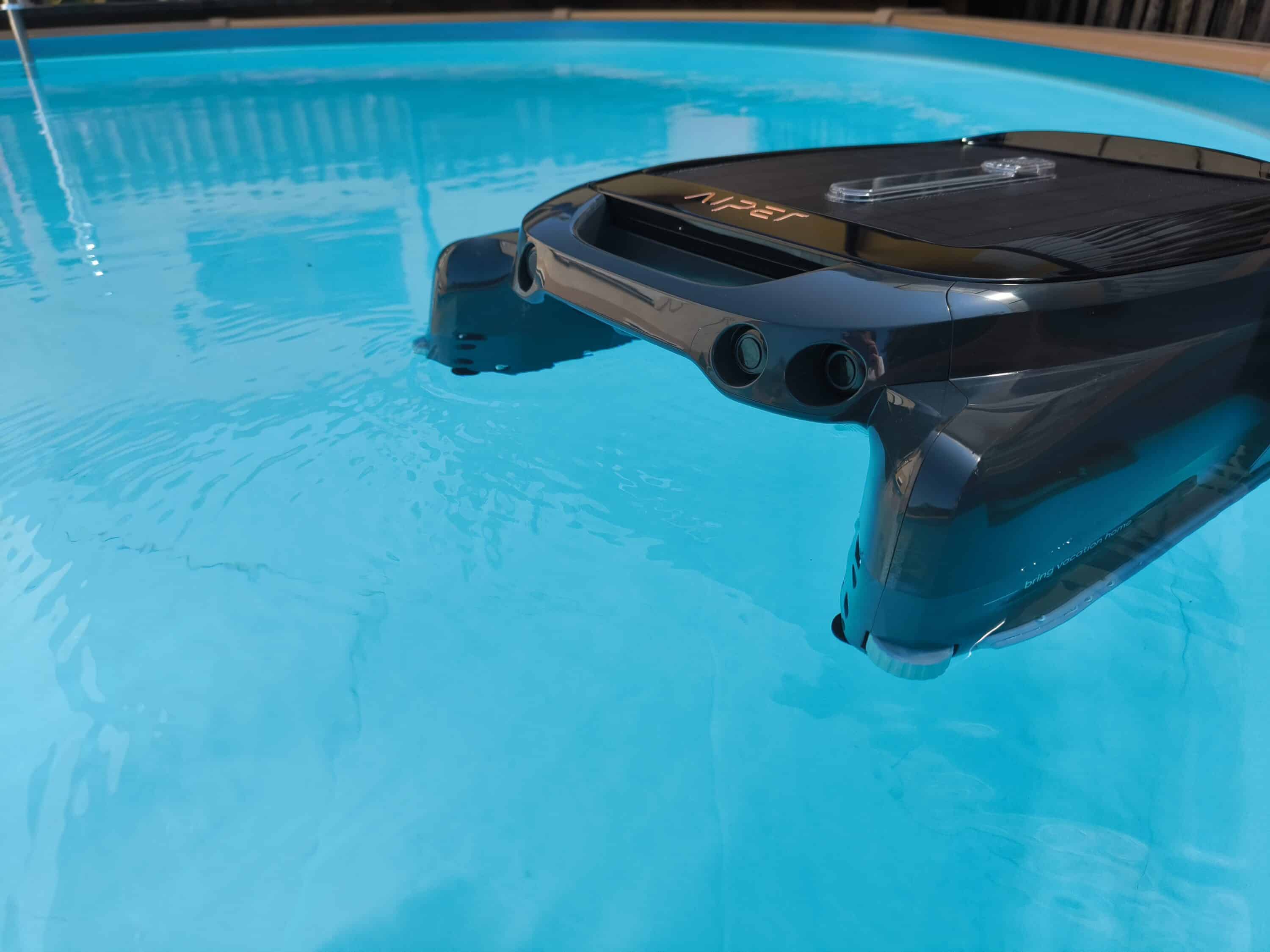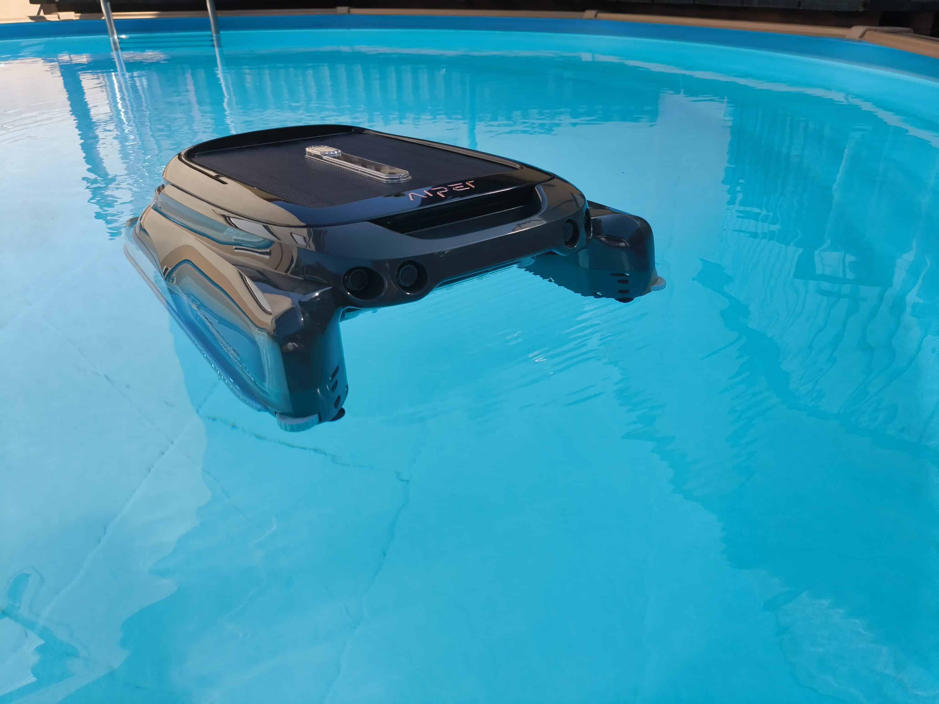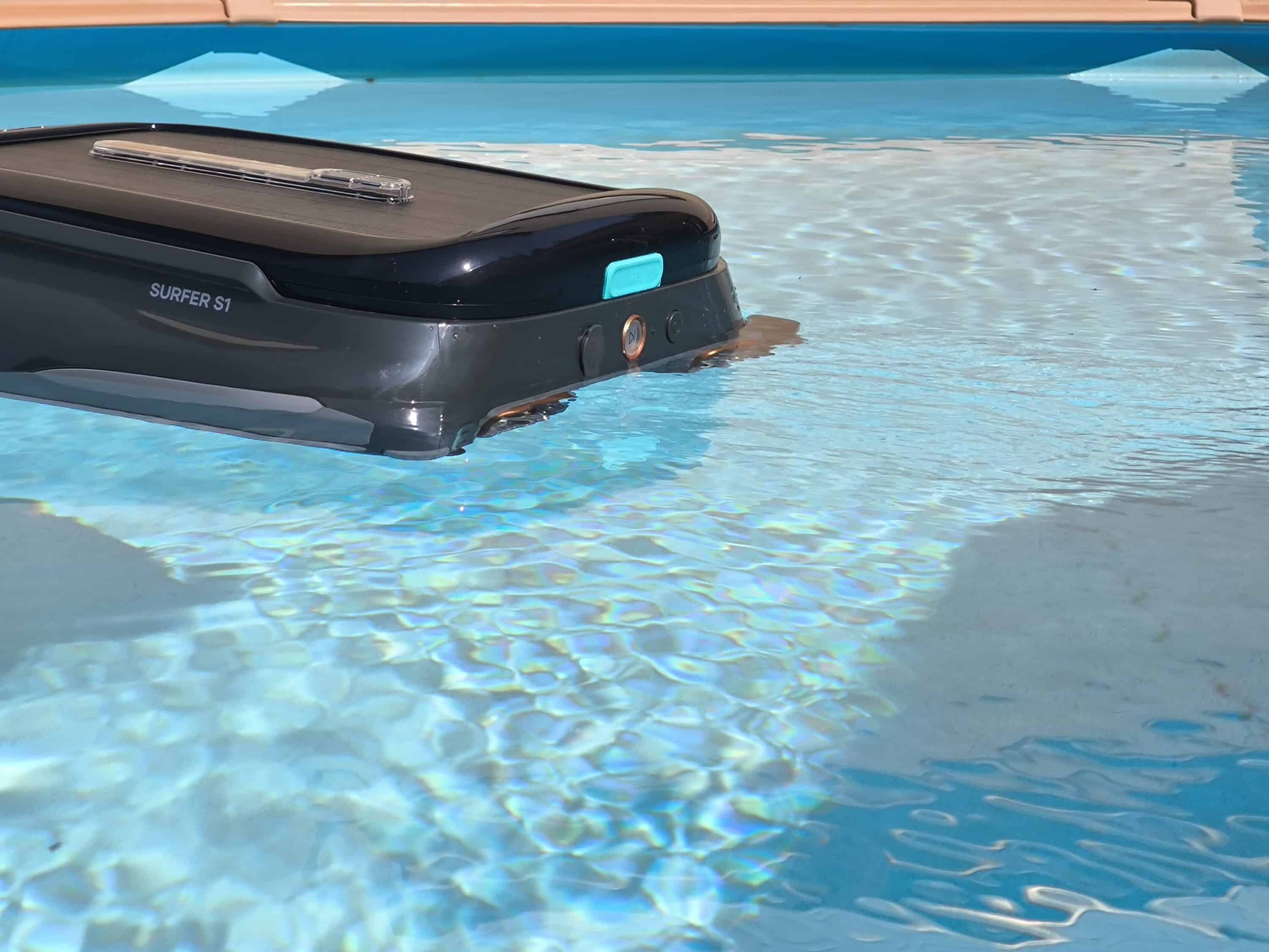 Navigation works quite well, even though the robot does not follow a fixed driving pattern. Instead, the Surfer S1 consistently drives across the pool and turns in again just before the wall. Thanks to its ultrasonic sensors, it can also recognize people in the pool and drive around them. This worked very well in the test. However, it must be mentioned that the sensors probably only detect obstacles at direct height. In our case, for example, the edge of the pool sticks out a little, which the AIPER Surfer S1 likes to bump into from time to time. The result is a few scratches in the paint on the two front sides of the robot. If necessary, a foam coating on the sides could have helped here, even if this would probably have been at the expense of the design.