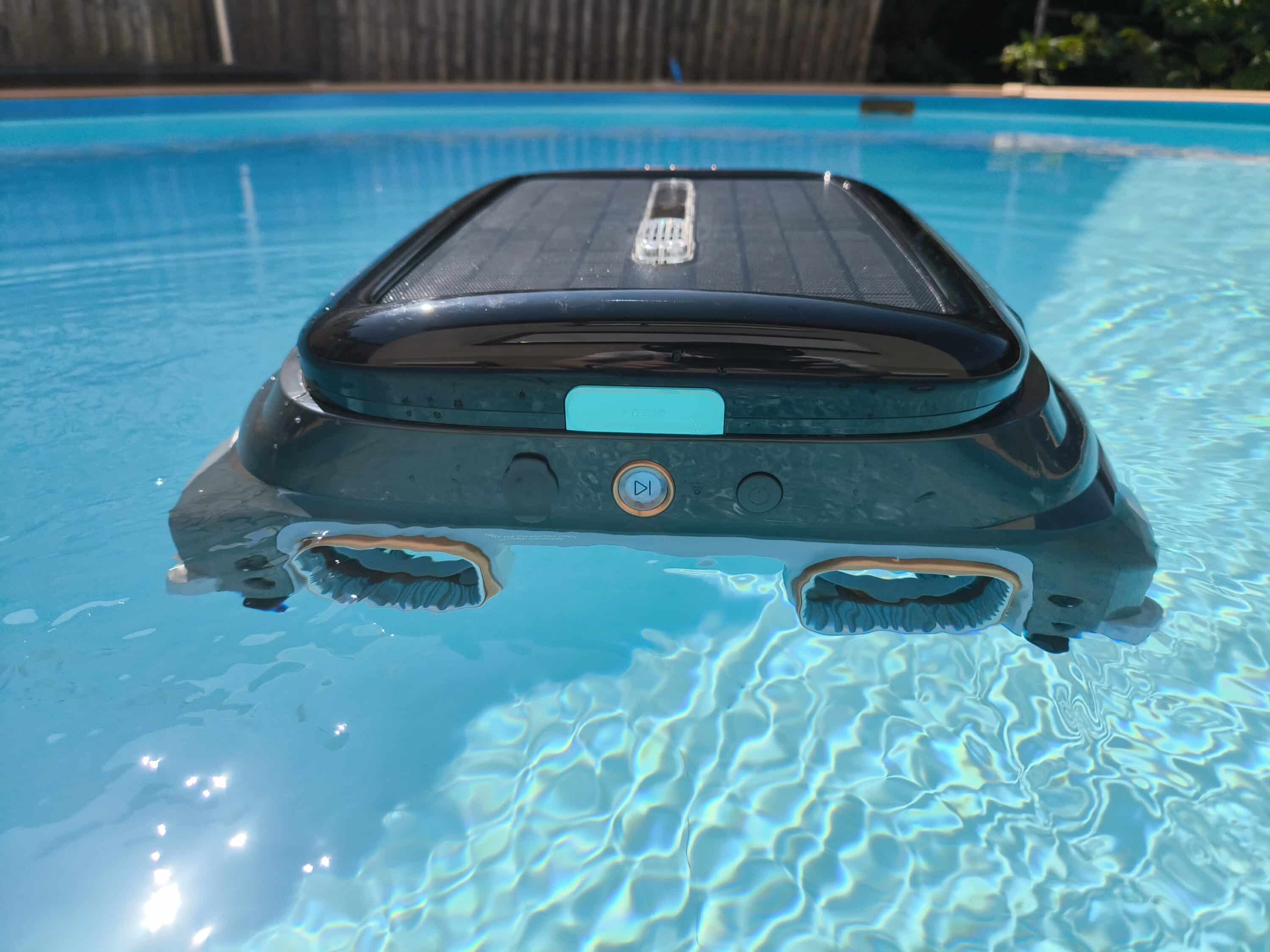 The AIPER Surfer S1 reached us with a 54% battery charge according to the app. As the robot has a large solar panel on the roof and the weather is very sunny at the moment, we opted for the environmentally friendly option. Accordingly, the pool robot went straight into the pool. To switch it on, simply press the power switch on the back of the housing for 2 seconds. Pressing the middle start/stop button again starts the cleaning process.