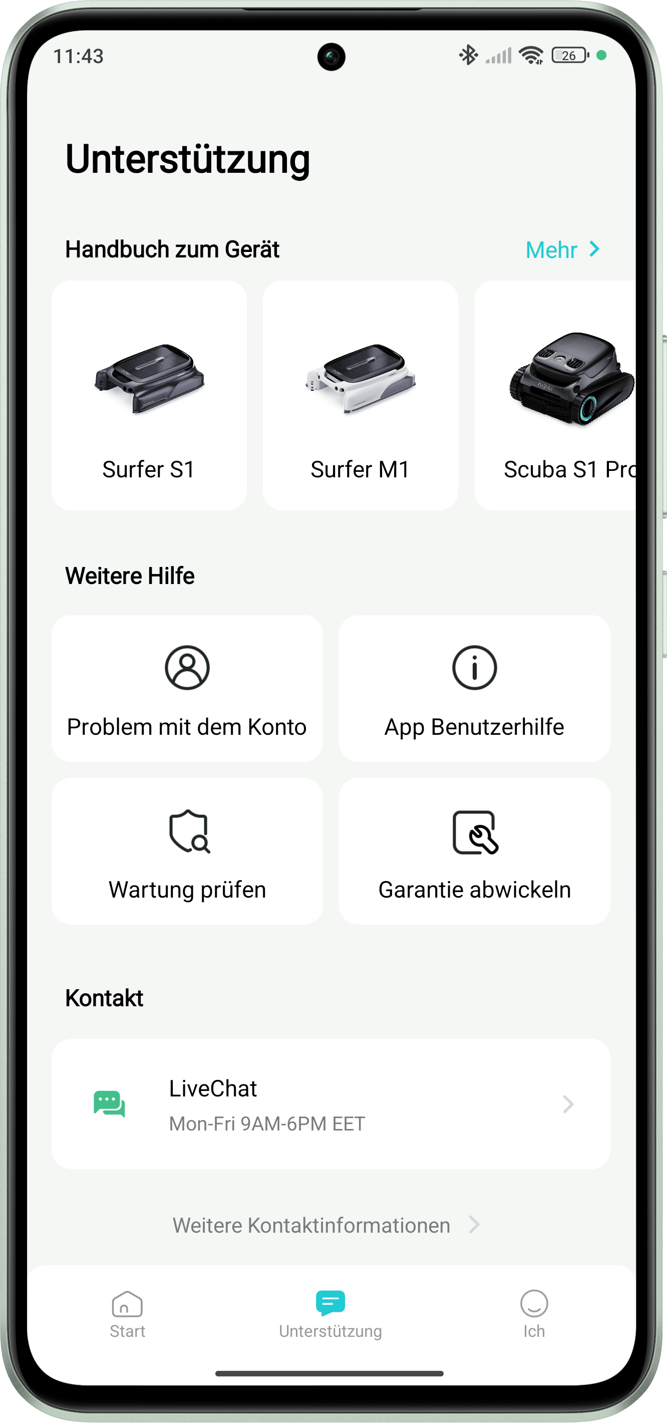 It is also possible to display the cleaning processes of the last seven days. There is a nice but, in our opinion, useful little feature under the “Support” tab. The instructions for all pool robots can be displayed digitally here. So anyone who likes to misplace manuals or can’t find them quickly will appreciate something like this. In the event of a defect, it is also possible to contact AIPER in this way or submit a warranty claim.