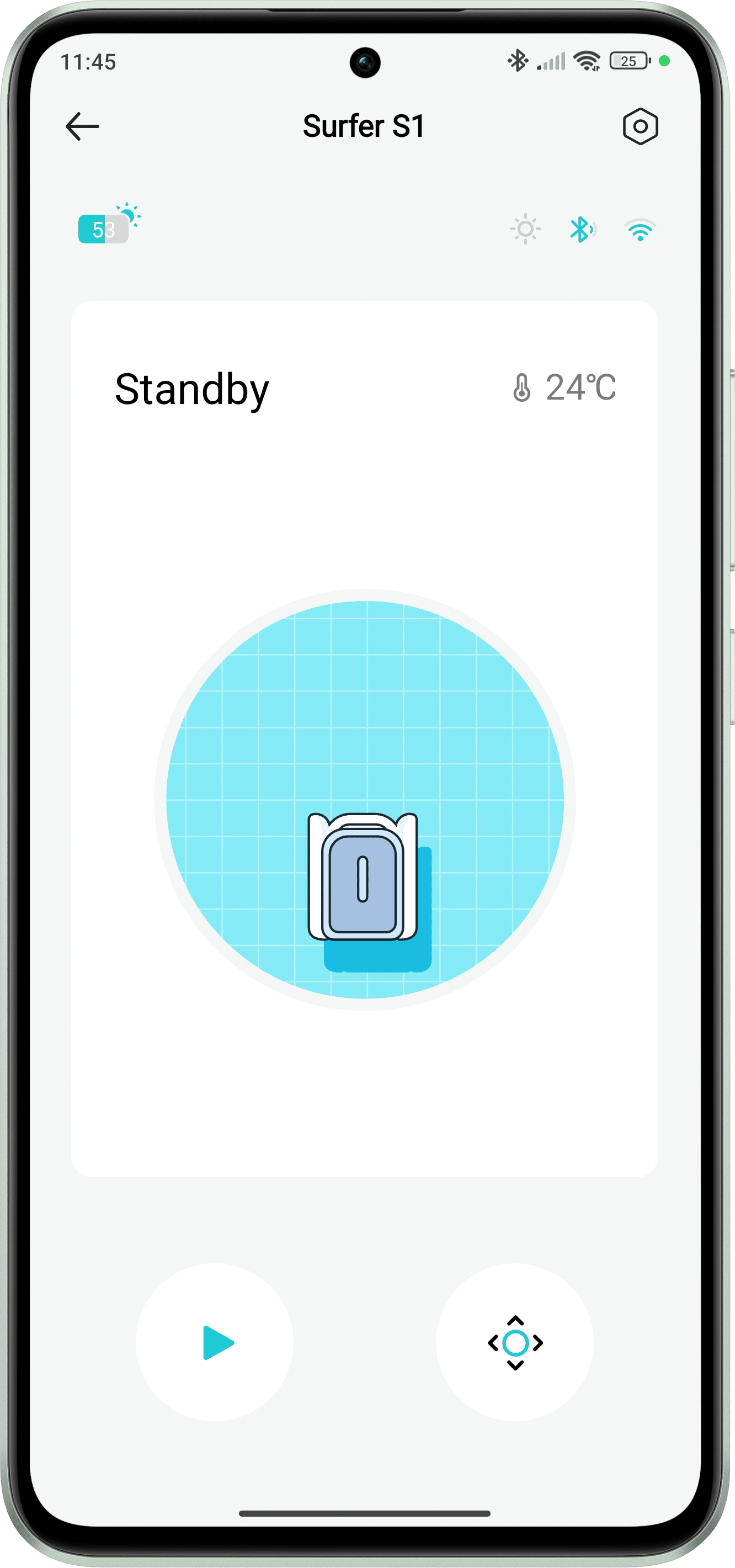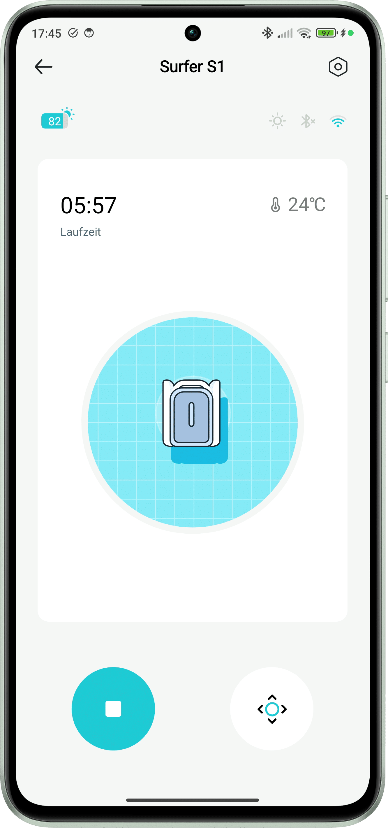 The app’s range of functions includes starting and stopping the cleaning process as well as manual control of the robot. So if you want the Surfer S1 to move to a specific dirty spot, you can control the whole thing using the joystick. It should be noted that direct turning with the swimming pool robot is not possible. Although the steering works without any problems, there is of course no precise steering as in a car. An active Bluetooth connection to the robot is also required. Ingenious: The current water temperature is also measured and can be called up in the app!