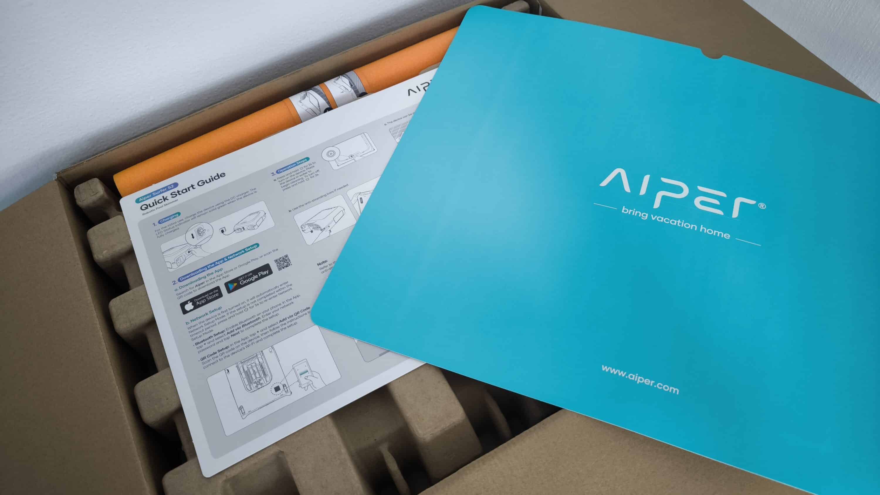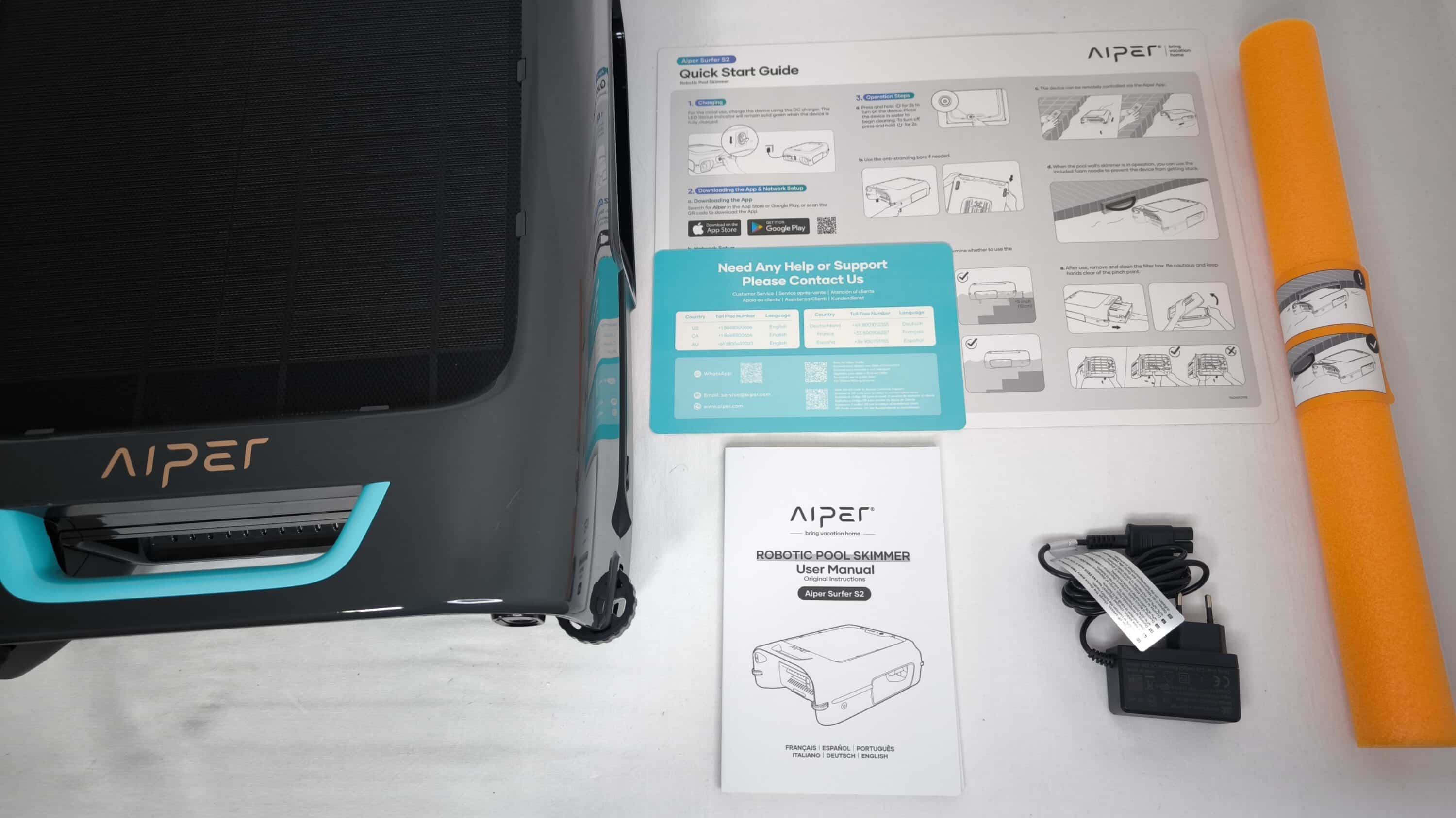 The scope of delivery of the AIPER Surfer S2 focuses on the essentials and can be summarized without a lot of superfluous frills. The pool robot itself is included, along with the associated power supply unit and the usual documentation. The latter include an operating or quick start guide, the cover of which is turquoise. Worth mentioning is the enclosed floating noodle, which can be inserted into your own pool skimmer. This prevents the Surfer S2 from being carried off course by the current.