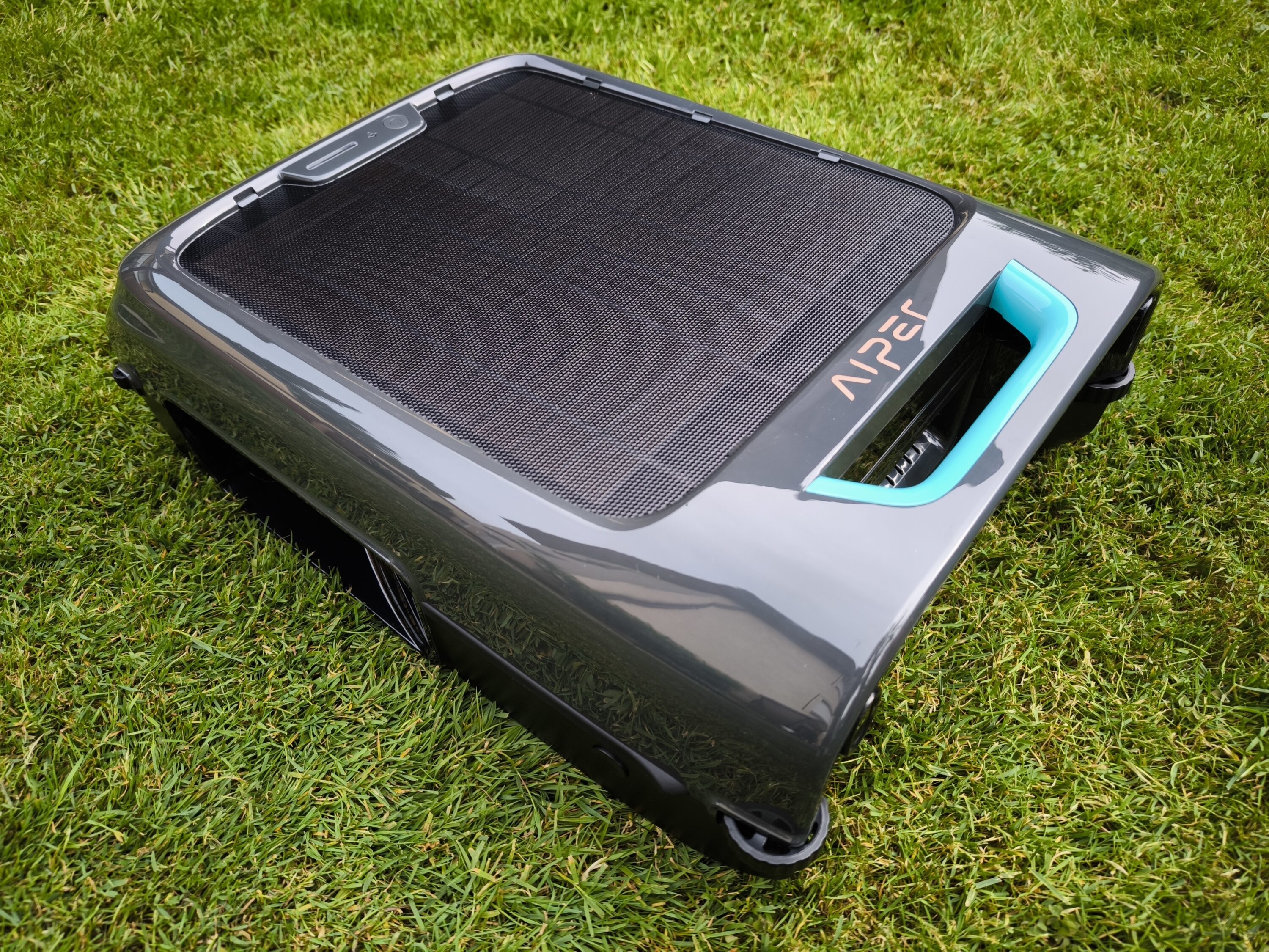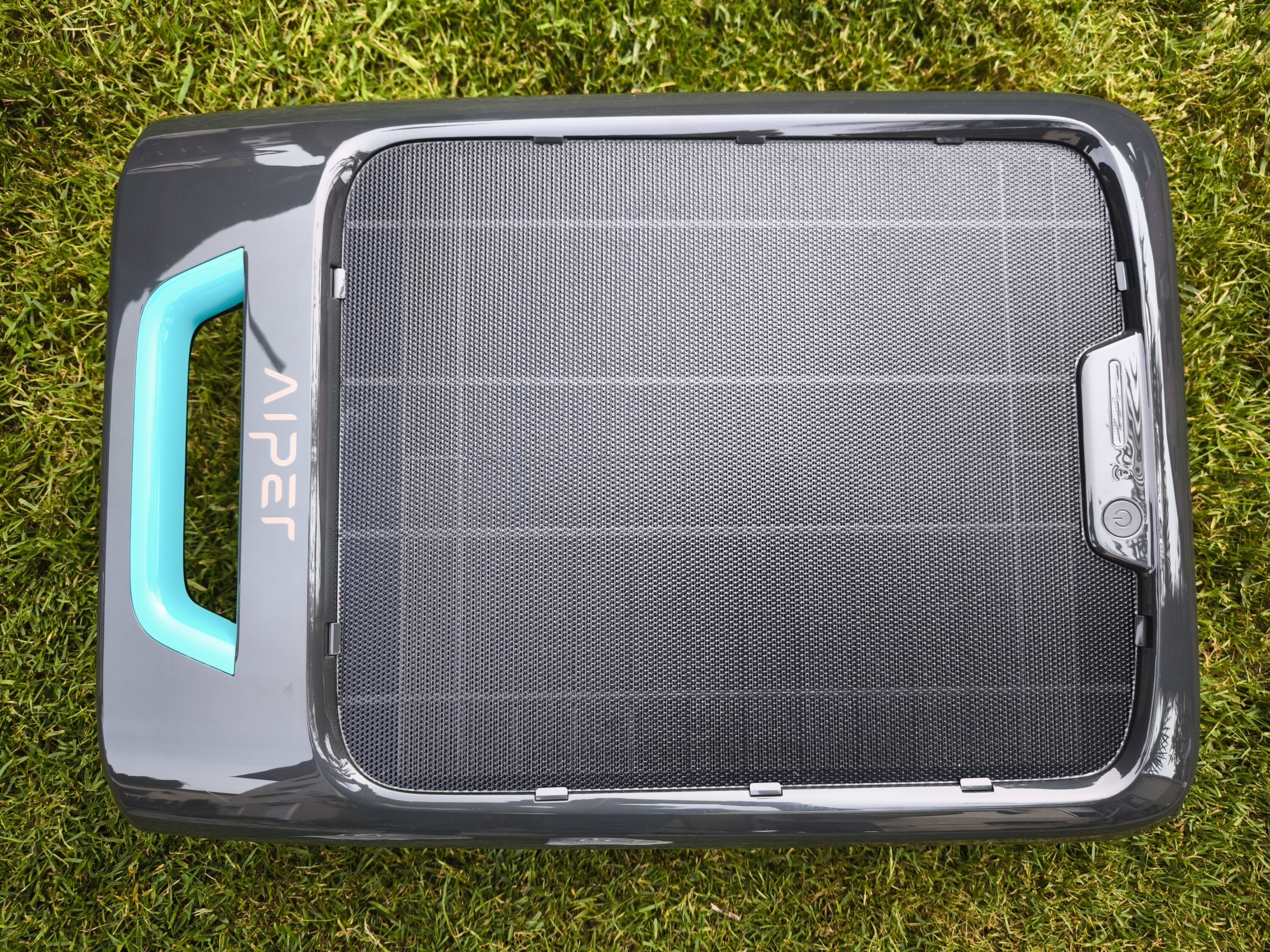 Apart from that, the main functionality of the pool robot has remained unchanged. The large solar panel is still located on the top of the device, which also houses the controls and carrying handle. The ultrasonic sensors for obstacle detection on the water also remain on the front as usual. In addition to the power connection, the two black propellers can also be seen on the back, which are highlighted with a bronze accent on the outside. The AIPER lettering on the carrying handle is also in the same color.