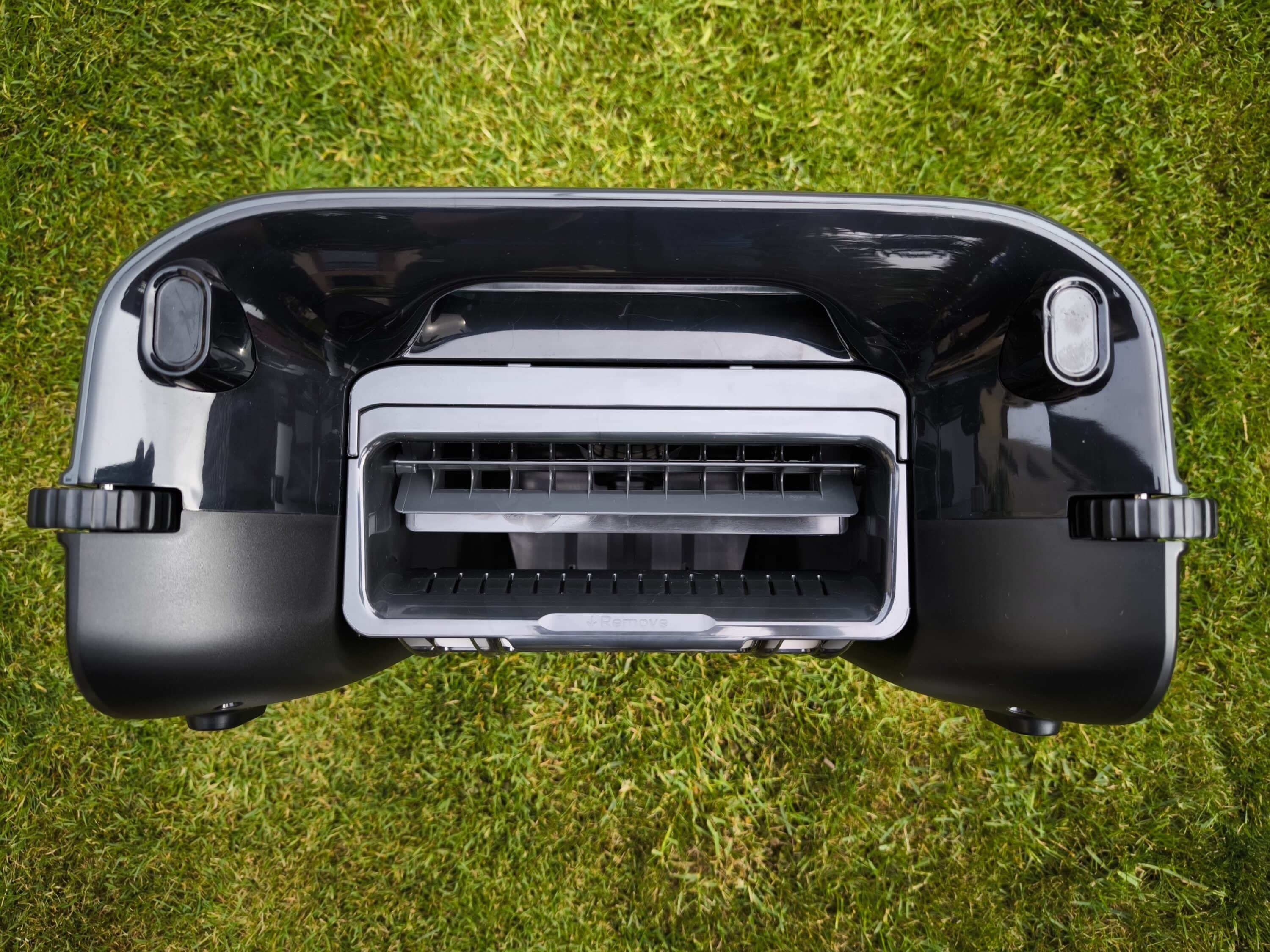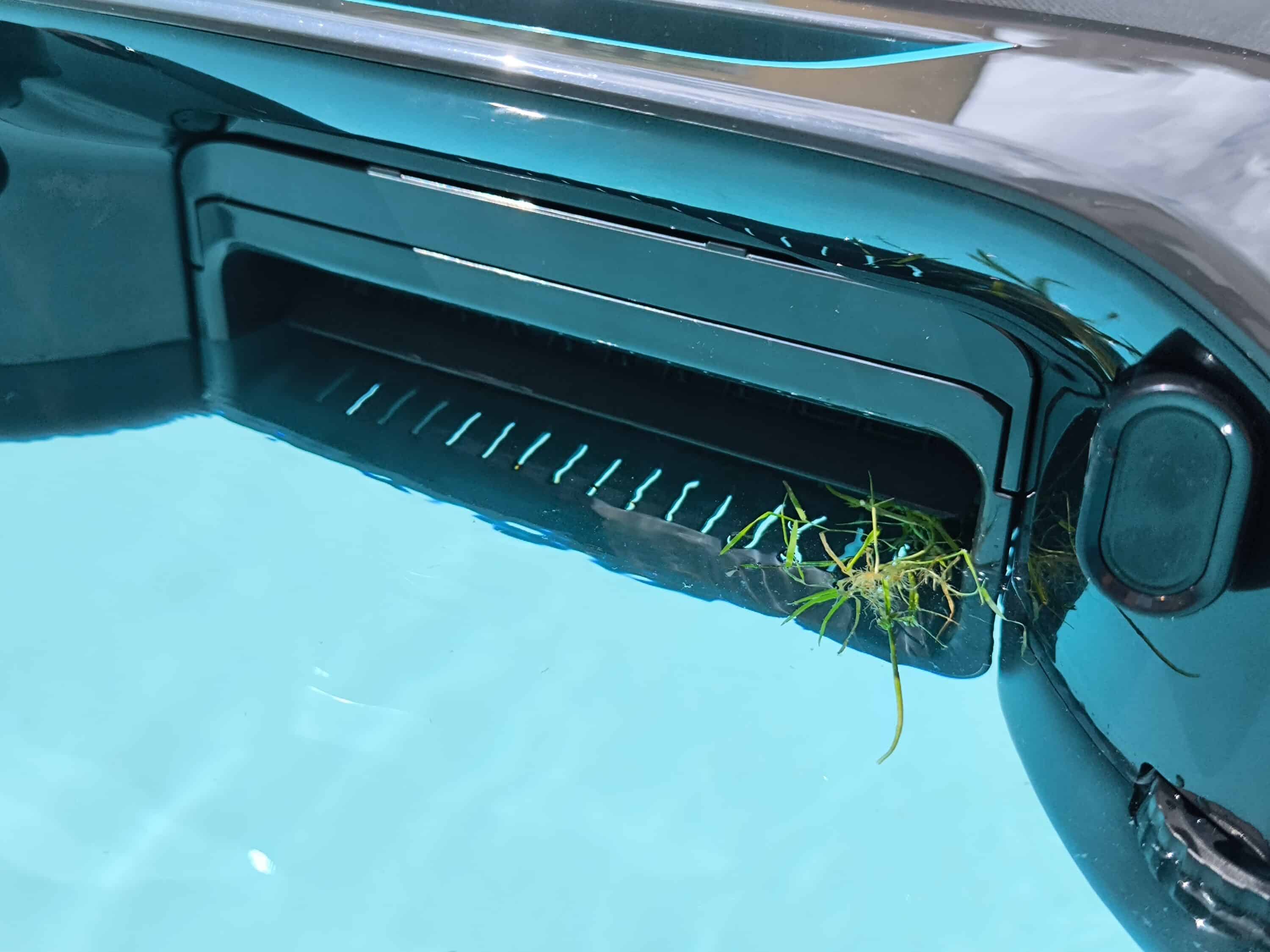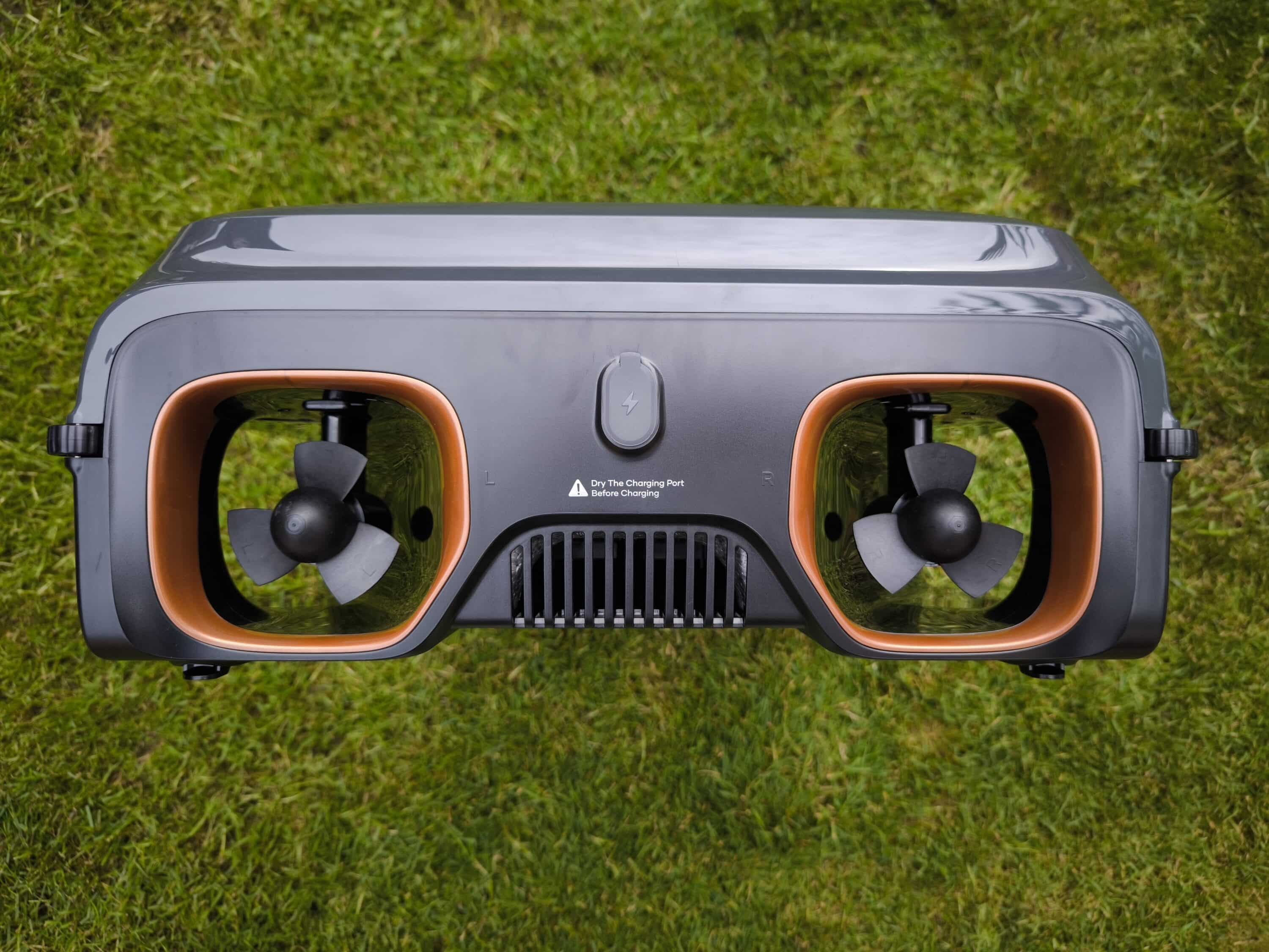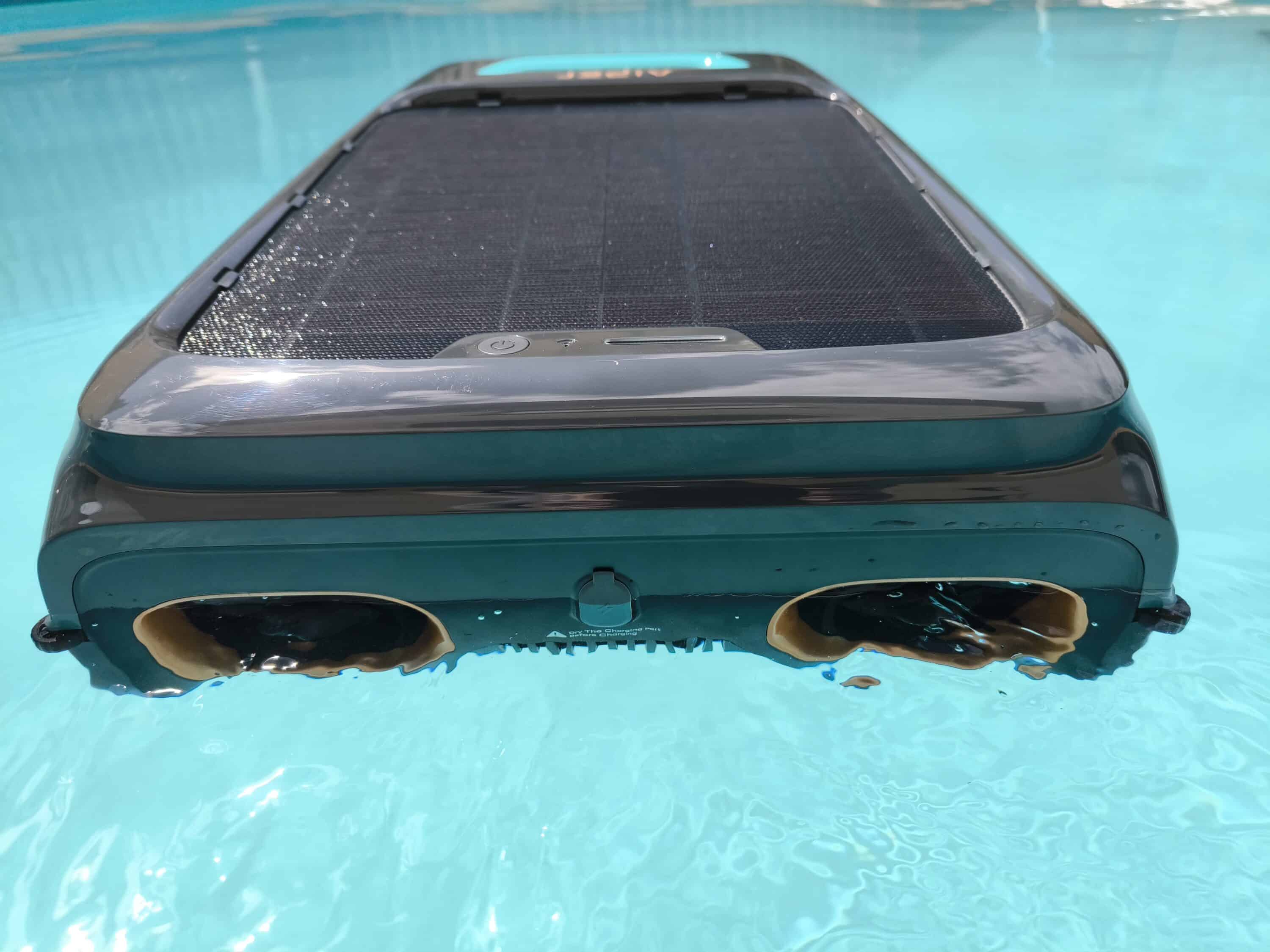 Let’s get to the hard facts of the AIPER Surfer S2, in other words: What can this thing do? The large solar panel has remained unchanged, but unlike its predecessor, it no longer has a cut-out in the middle. With the Surfer S1, the entire deck could be pushed back to access the filter basket. This feature is no longer available on the new model, as the filter basket can now be removed from the front. There are still three brushless motors. Two of them are used to drive the propellers and one for the impeller.
