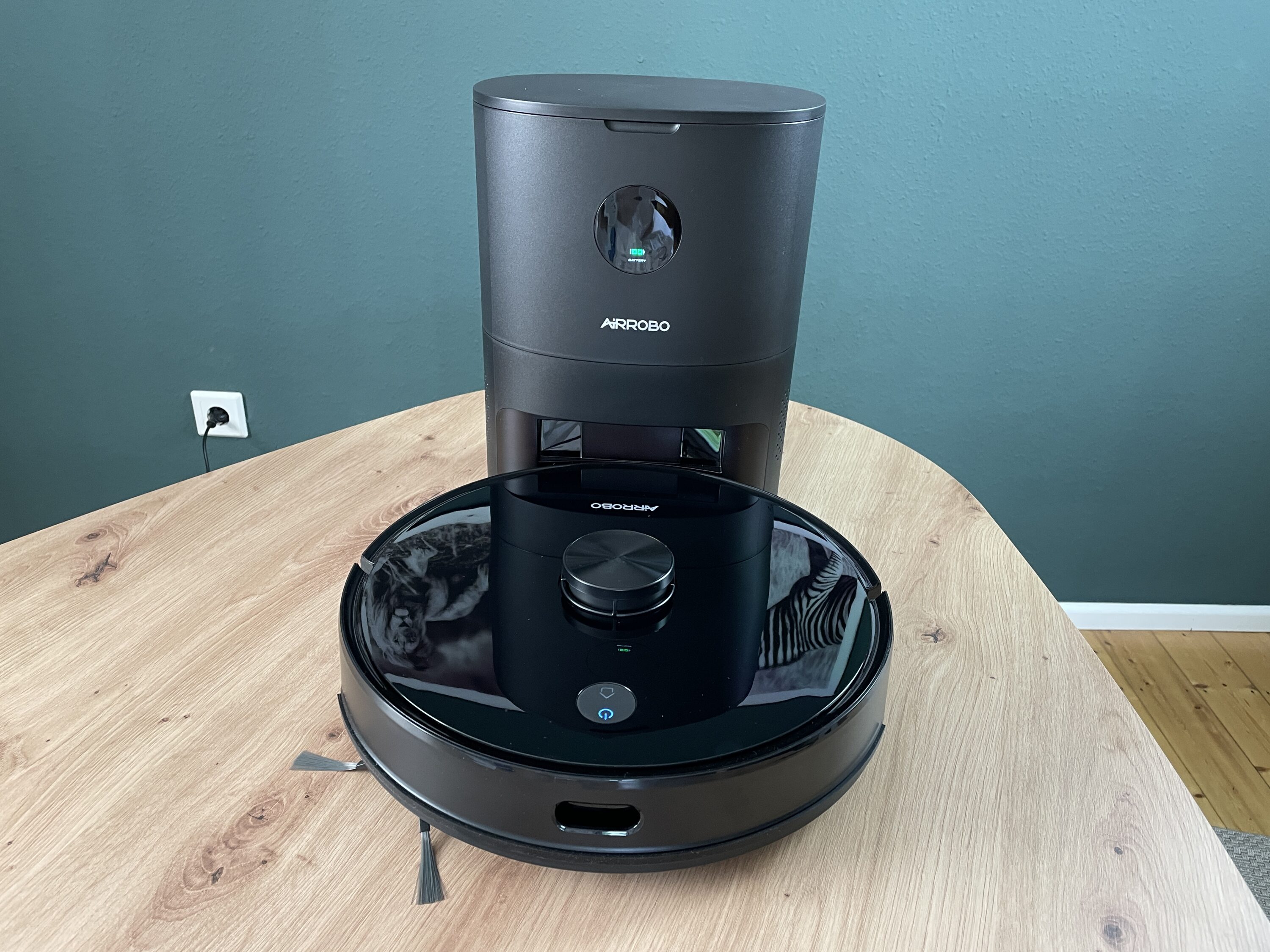 The extraction station represents the base for the AIRROBO T10+. This is where it returns to after successful cleaning and automatic debris removal begins. With a suction power of 26 kPa, it reliably empties the 300 ml dust container with an efficiency of 98%. As mentioned before, this creates some noise that can be compared to an older 1000 to 2000 watt vacuum cleaner. However, this is over after a few seconds and the robot vacuum cleaner is ready for use again. While the T10+ is connected to the suction station, the battery is charged. The status can be seen on the display in the front of the station.